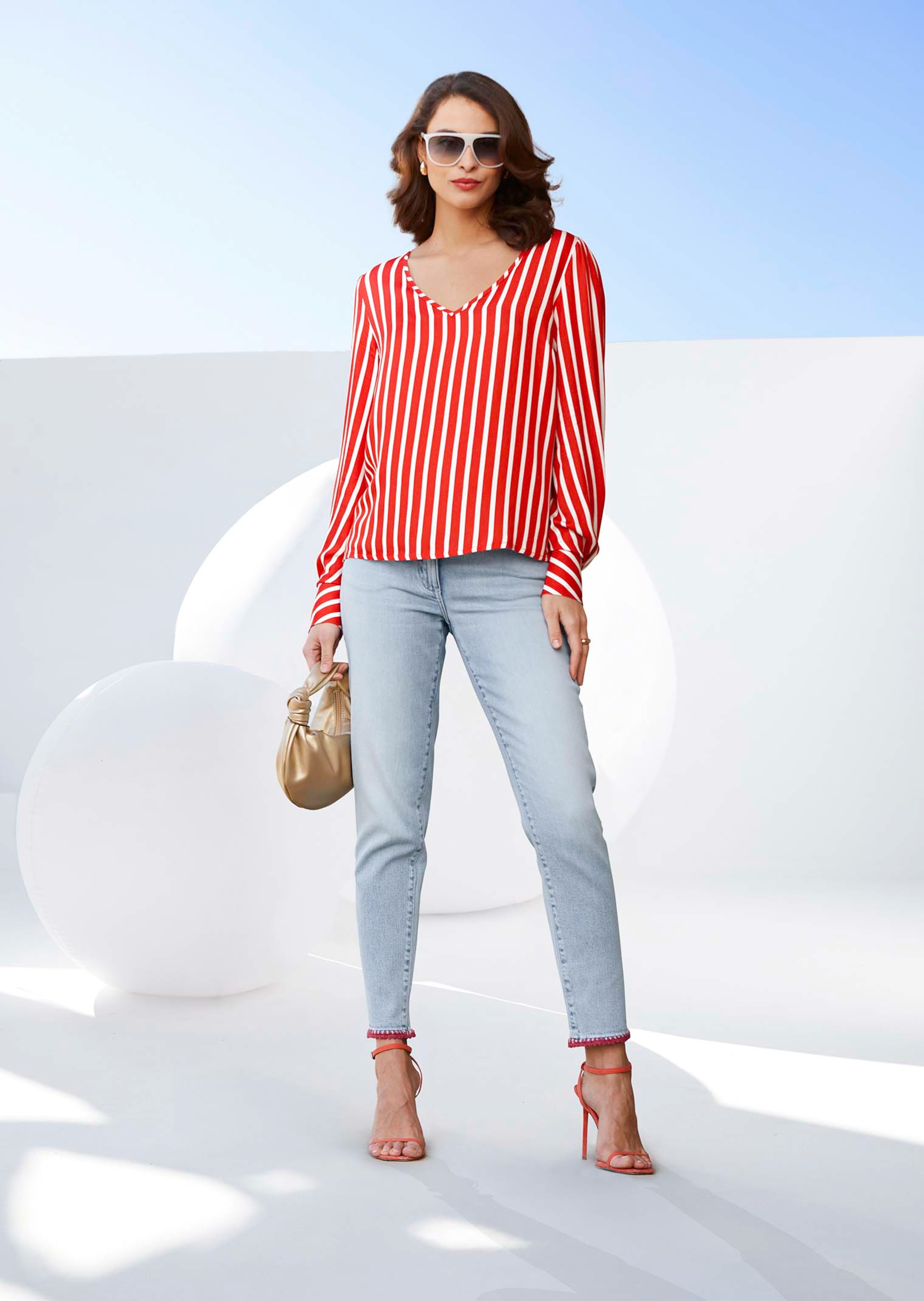 Bluse mit Längsstreifen. Ärmel, Manschetten und Piping am V-Ausschnitt mit Diagonalstreifen. Leicht satinierte, fließende Ware. Länge in Gr. 38 ca. 62 cm.
