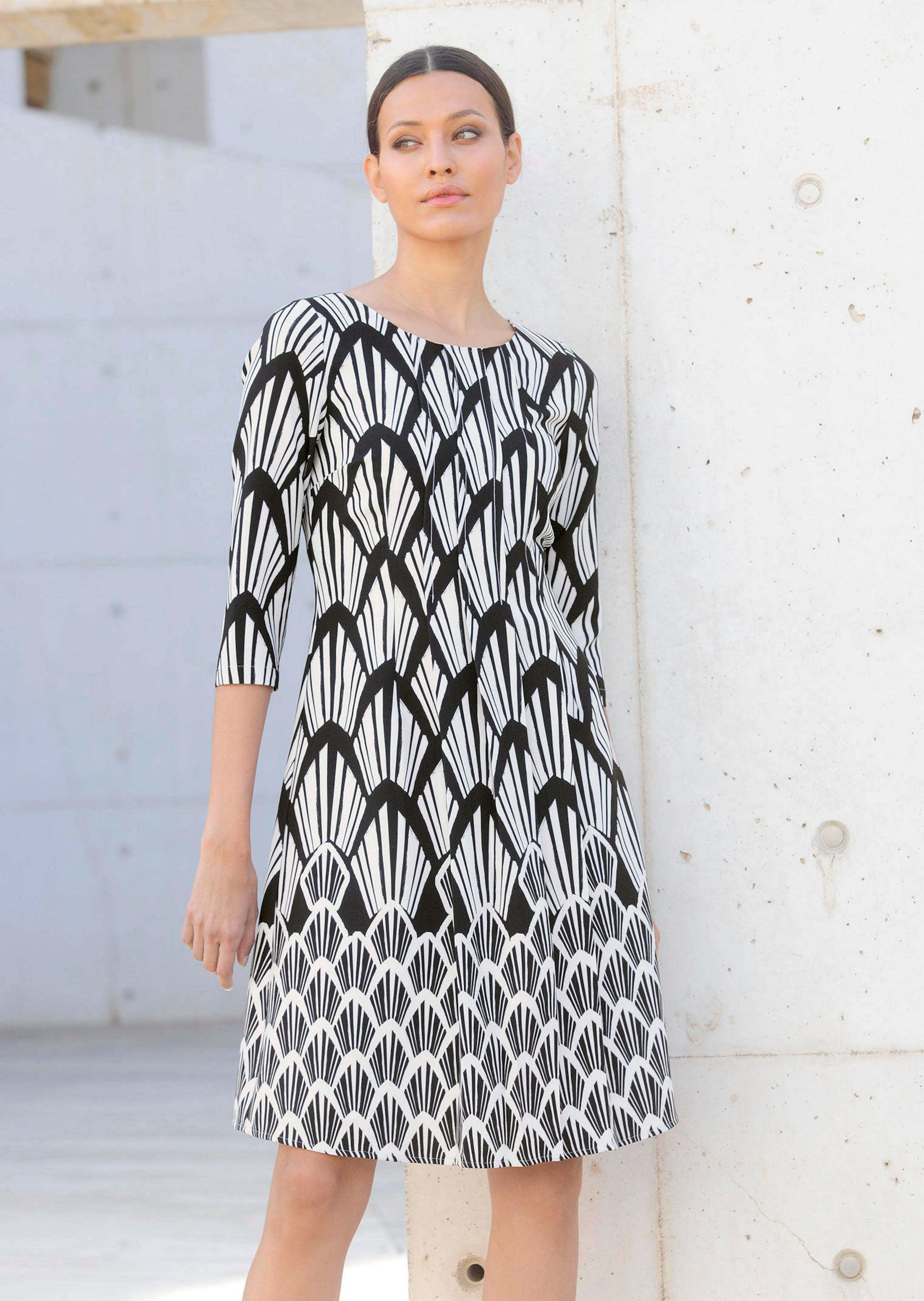 Verschiedene Styles für die unterschiedlichsten Anlässe finden Sie hier in unserem Onlineshop. Wie wäre es zum Beispiel mit diesem Druckkleid von Alba Moda? Ein besonders schönes Detail ist das grafische Muster. Es verfügt über einen U-Boot-Ausschnitt. Durch seine figurumspielende Form gibt es sich besonders schmeichelhaft. 3/4-langer Ärmel mit geradem Abschluss. Hergestellt aus pflegeleichtem Material. Unser Style-Tipp: Es sind die Kleinigkeiten, die aus Ihrem Outfit den perfekten Look machen: Ein schickes Paar Schuhe und eine schöne Tasche, gerne auch farblich aufeinander abgestimmt, verleihen ihm den letzten Schliff! Machen Sie sich selbst eine Freude mit dem Druckkleid von Alba Moda – jetzt einfach in unserem Shop bestellen!