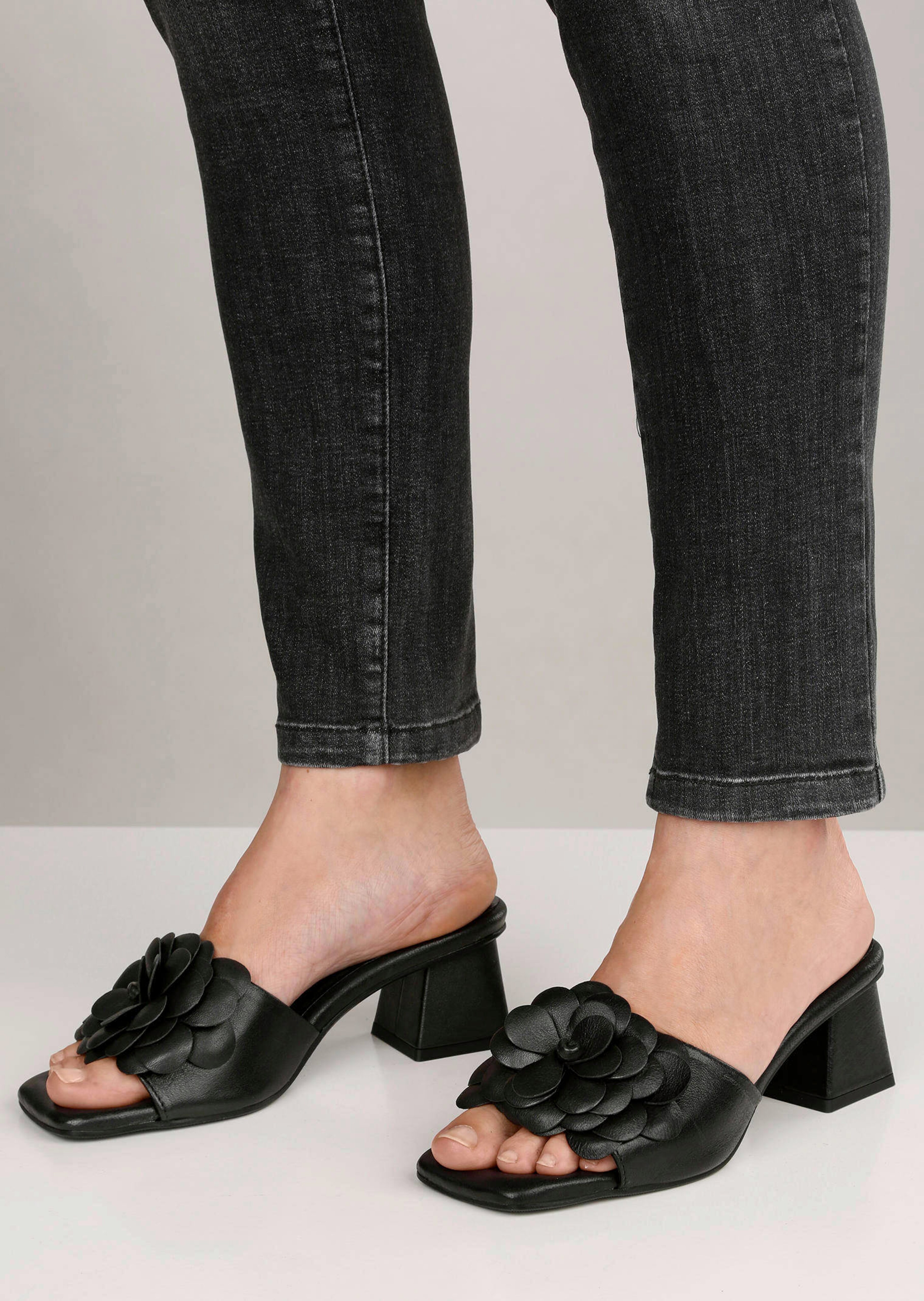 - Elegante Mules mit aufgesetzten Blumendekor, Skulpturaler Absatz mit Leder überzogen, Ein edler Eyecatcher zu romantischen Kleidern und lässigem Denim, Made in Portugal, Besonders weiches Leder