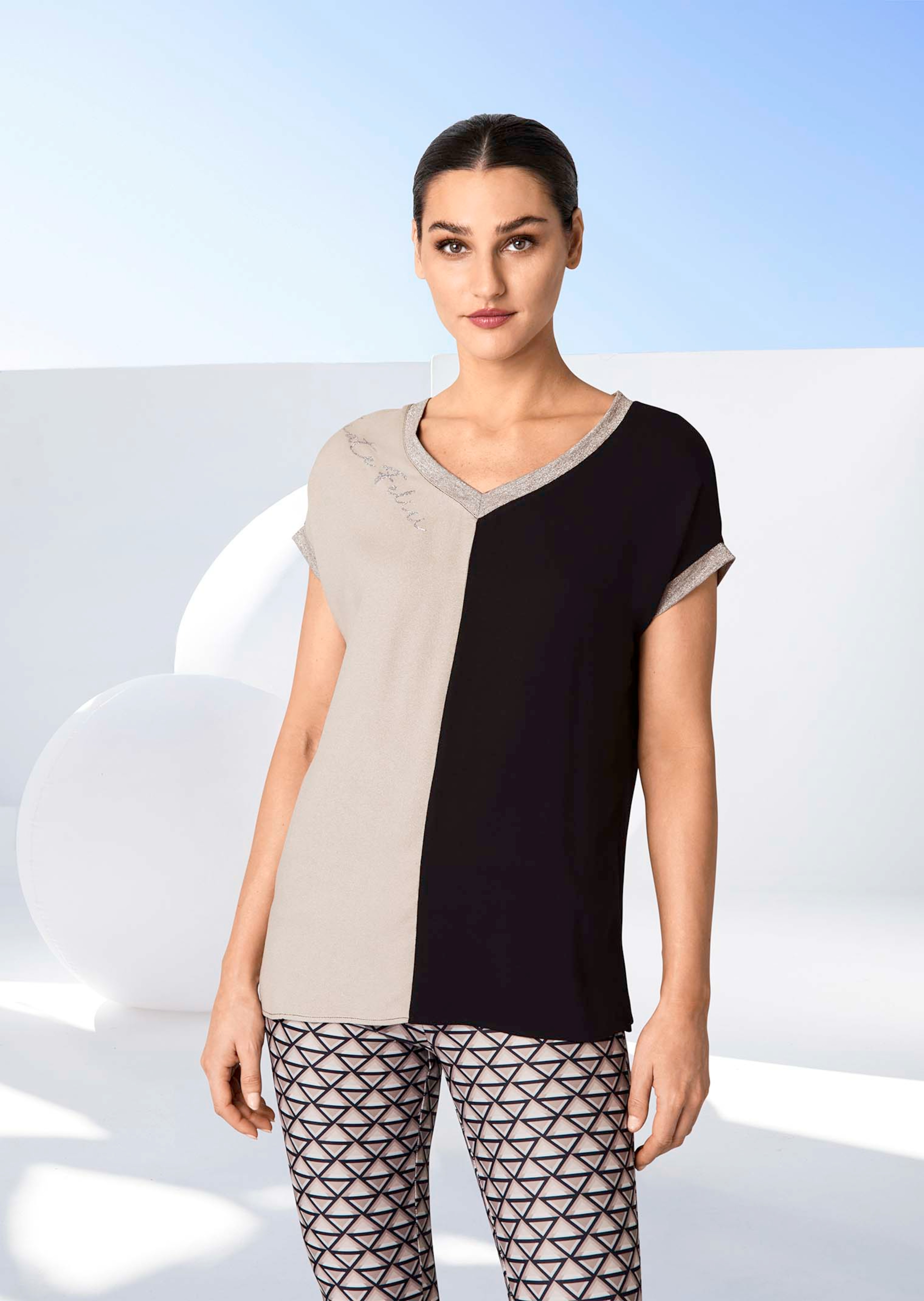 Setzen Sie ein modisches Statement mit diesem Colourblock-Shirt von ALBA MODA! Das zweifarbige Design mit schimmernder Lurexpaspel am V-Ausschnitt verleiht dem Shirt das gewisse Etwas. Die lässigen Ärmel mit Aufschlag und die figurumspielende Form machen es zum idealen Stylingpartner – ob zur Skinny Jeans oder zur trendigen Paperbag-Hose.