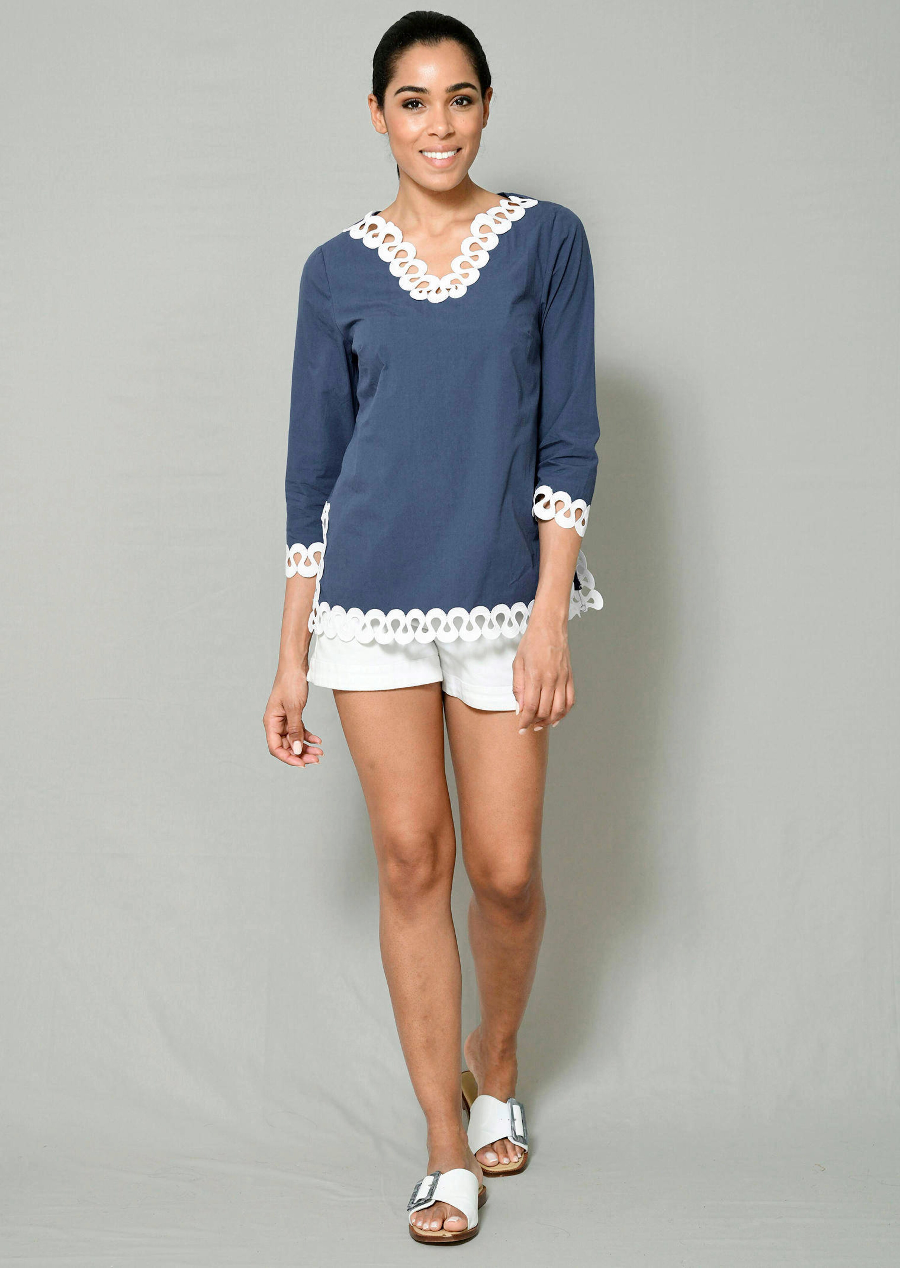• Schöner V-Ausschnitt, Mit seitlichem Schlitz am Saum, Reine Baumwolle, Bequeme Schlupfform, Sommerleicht-Qualität