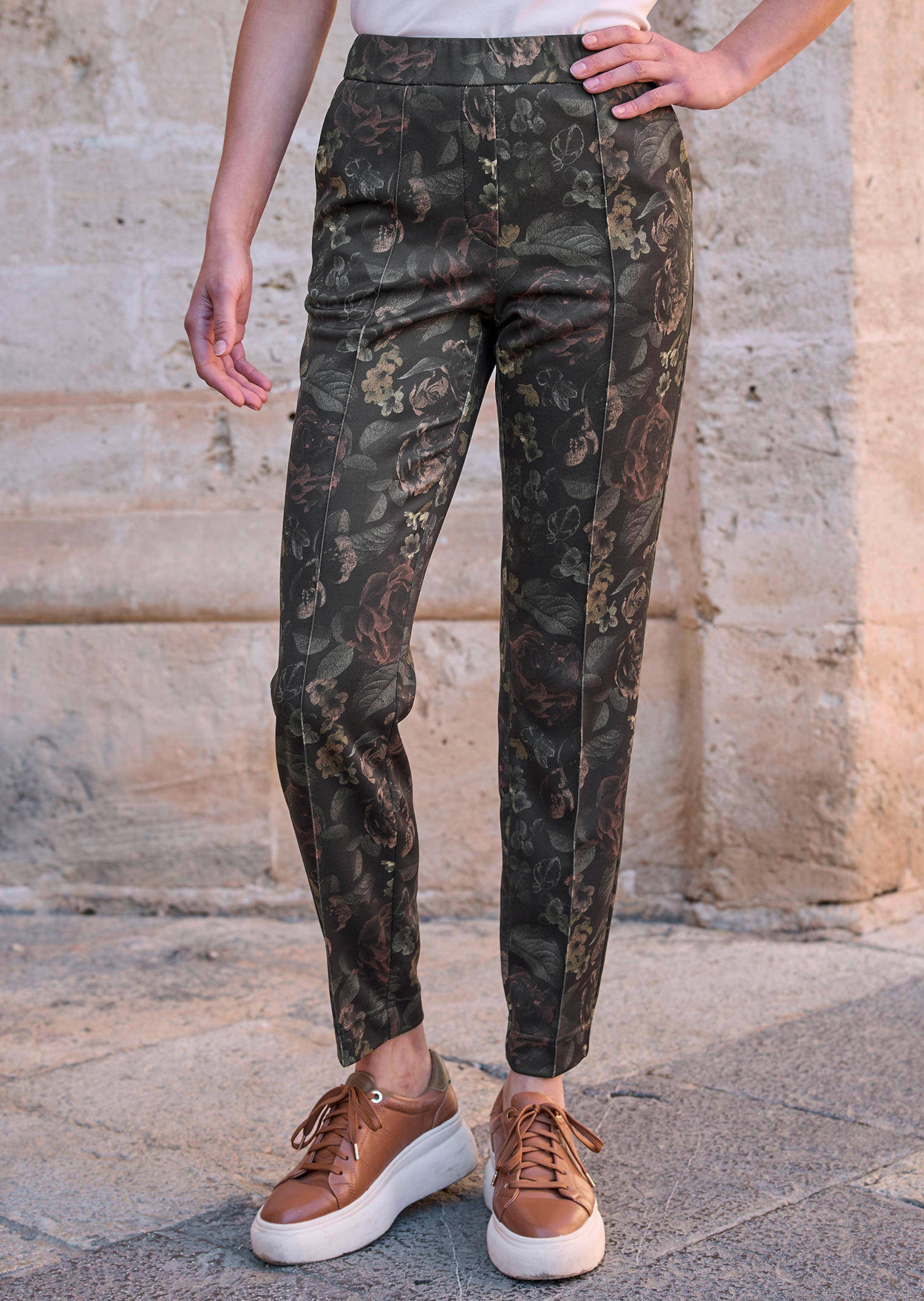 Die gemusterte Hose ist ein perfekter Kombipartner für alle, die Mode lieben und das auch zeigen möchten. Das florale Muster bringt Abwechslung in den Look und ist in dezenter Farbgebung vielseitig kombinierbar. Schönes Detail ist die abgenähte Bügelfalte, die das Bein optisch streckt. Die hochwertige Jacquard-Qualität mit bequemem Stretch-Komfort macht auch das Tragen zum puren Genuss. Mit den Zier-Reissverschlüssen und den Ziertaschen ist jedes Detail durchdacht und betont den lässigen Chic. Styling-Tipp: Kombiniere die Jacquard-Hose mit einer lockeren Strickjacke in passender Farbe, die das florale Muster unterstreicht.