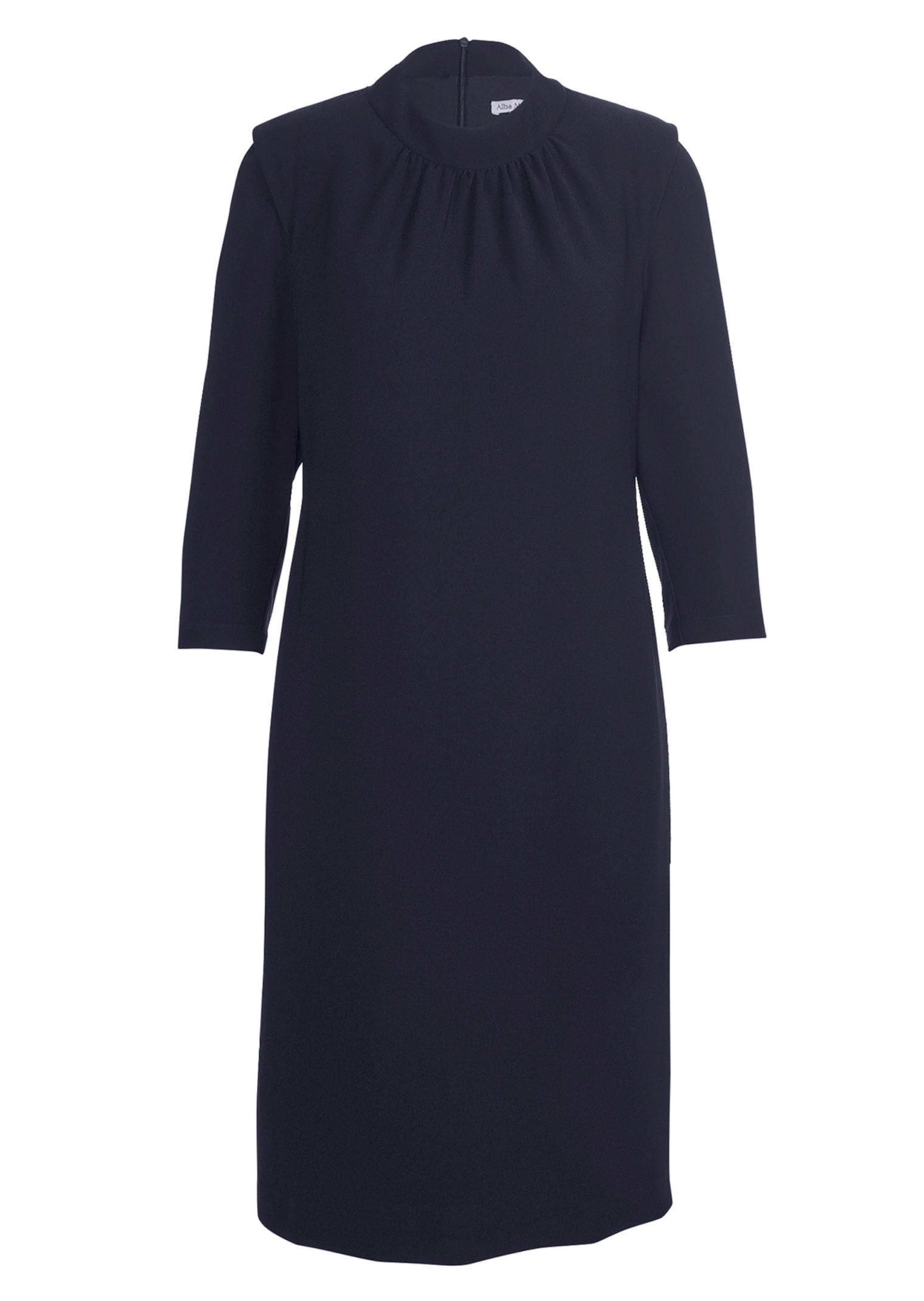 Kleid in Crepe-Qualität. Mit in Falten gelegtem hochgeschlossenem Kragen. Schulterpolster und Nähte auf der Rückseite für optimalen Sitz. Mit 3/4-Ärmeln. Reißverschluss auf der Rückseite. Knielang. Länge in Gr. 38 ca. 98 cm.