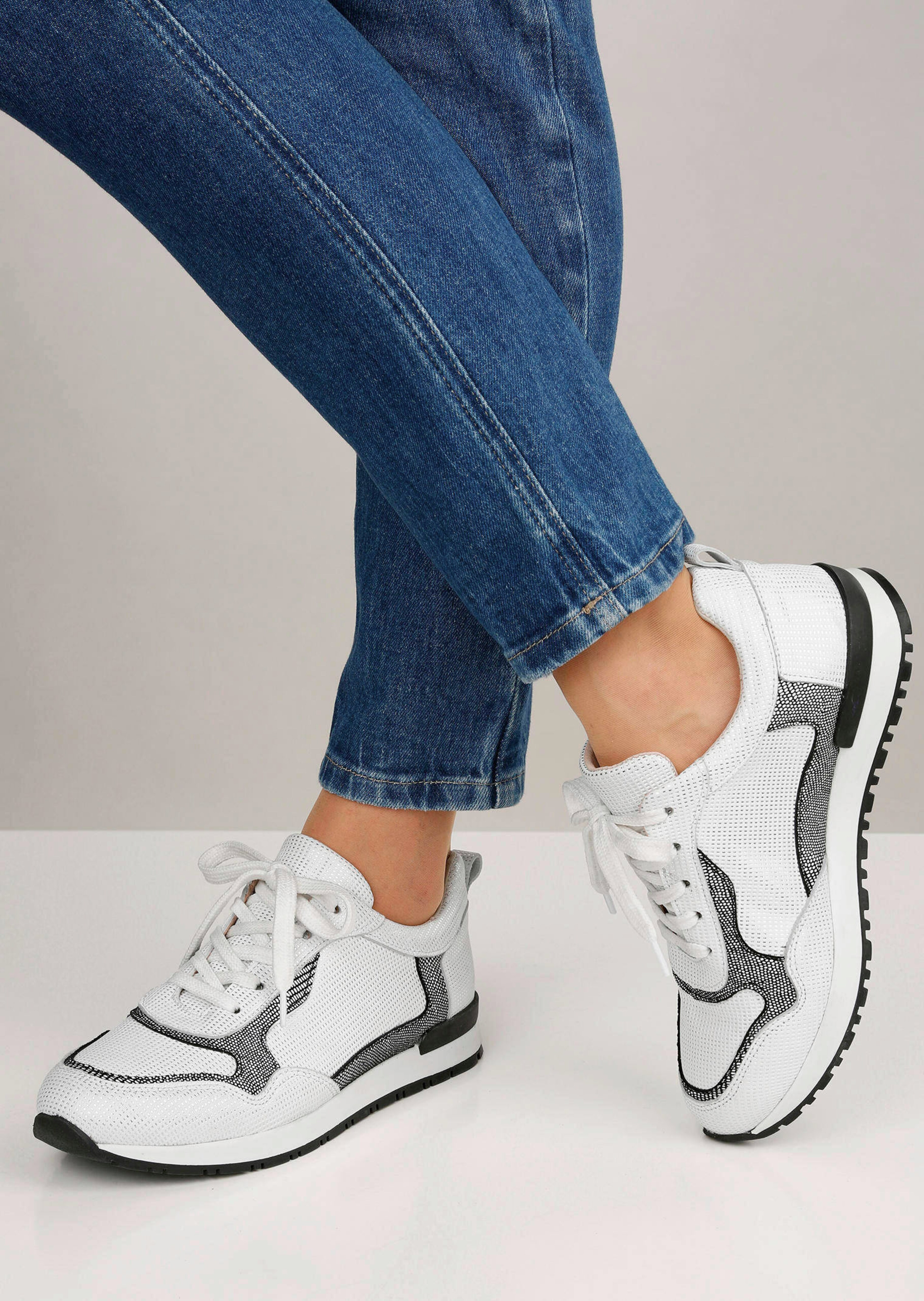 Dieser Sneaker im modernen Look von Alba Moda sind aus Leder und Rauleder gefertigt. Mit Anziehlasche. Flacher Absatz mit einer Höhe von 2,5 cm. Guten Halt garantiert die Sohle aus Synthetikmaterial. Die Decksohle ist aus Textilmaterial. Dieses Modell hat leicht profilierte Sohle. Für einen normalen Fuß geschnitten. Als Verschluss dient eine Schnürung. Diese Schuhe entsprechen dem Größensystem: Europäisch (EU).