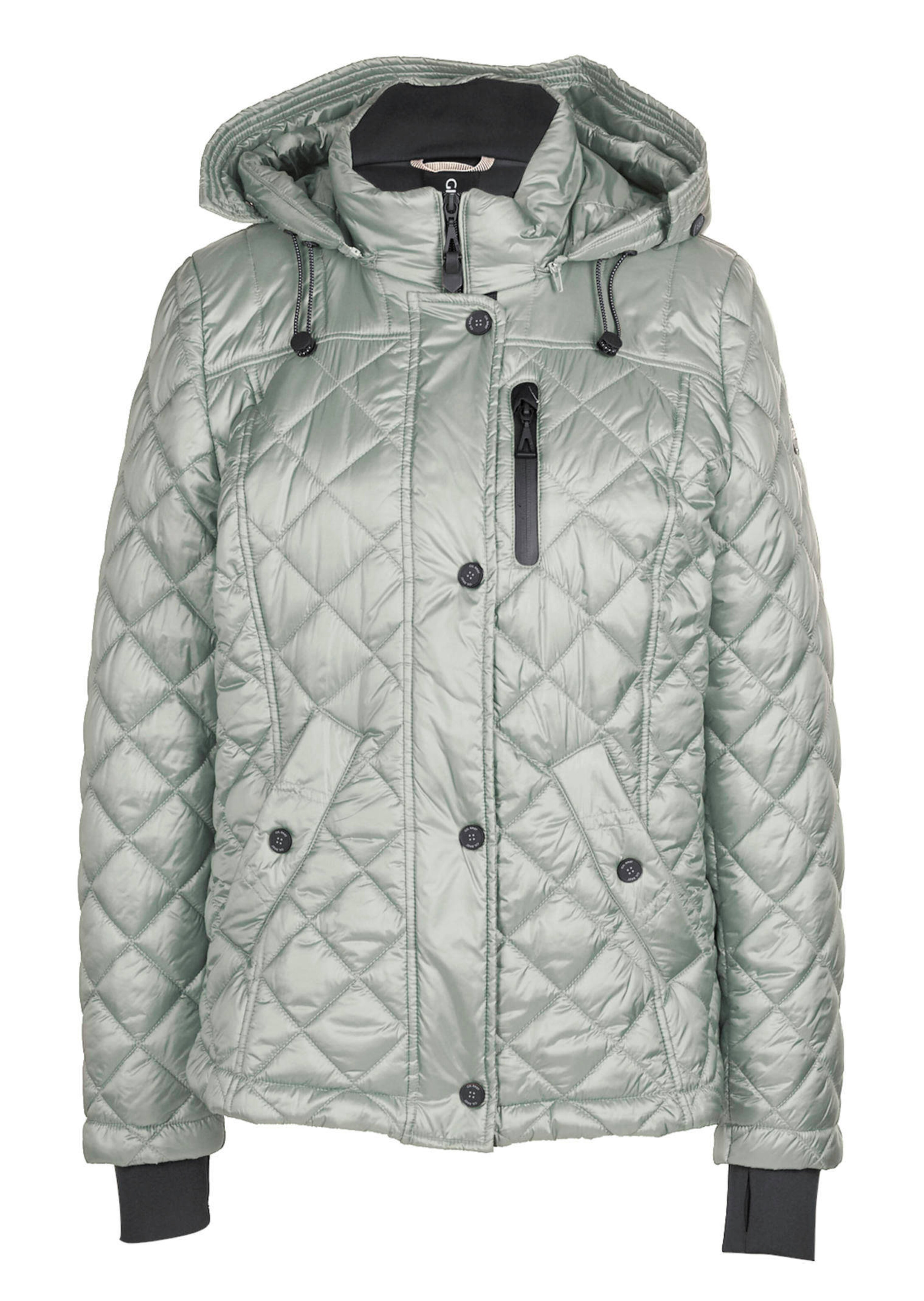 Jacke in sportivem Steppdesign von GIL BRET, die Ihrem Active Look das gewisse Etwas verleiht. Das Modell ist leicht tailliert und mit einem Stehkragen gearbeitet, die Kapuze mit Tunnelzug ist abnehmbar. Aufgenähte Bänder und die Rippenbündchen an den Ärmelsäumen setzen kontraststarke Akzente. Die Leistentaschen lassen sich mit Druckknöpfen schliessen. Auch der Reissverschluss vorne ist mit einer Druckknopfblende verdeckt. Länge in Gr. 38 ca. 68 cm. Styling-Tipp: Wenn schon, denn schon: Zum sportlichen Modell kombinieren Sie einen Sweater, Joggpants und Turnschuhe – schon können Sie losjoggen oder mit dem Hund Gassi gehen!