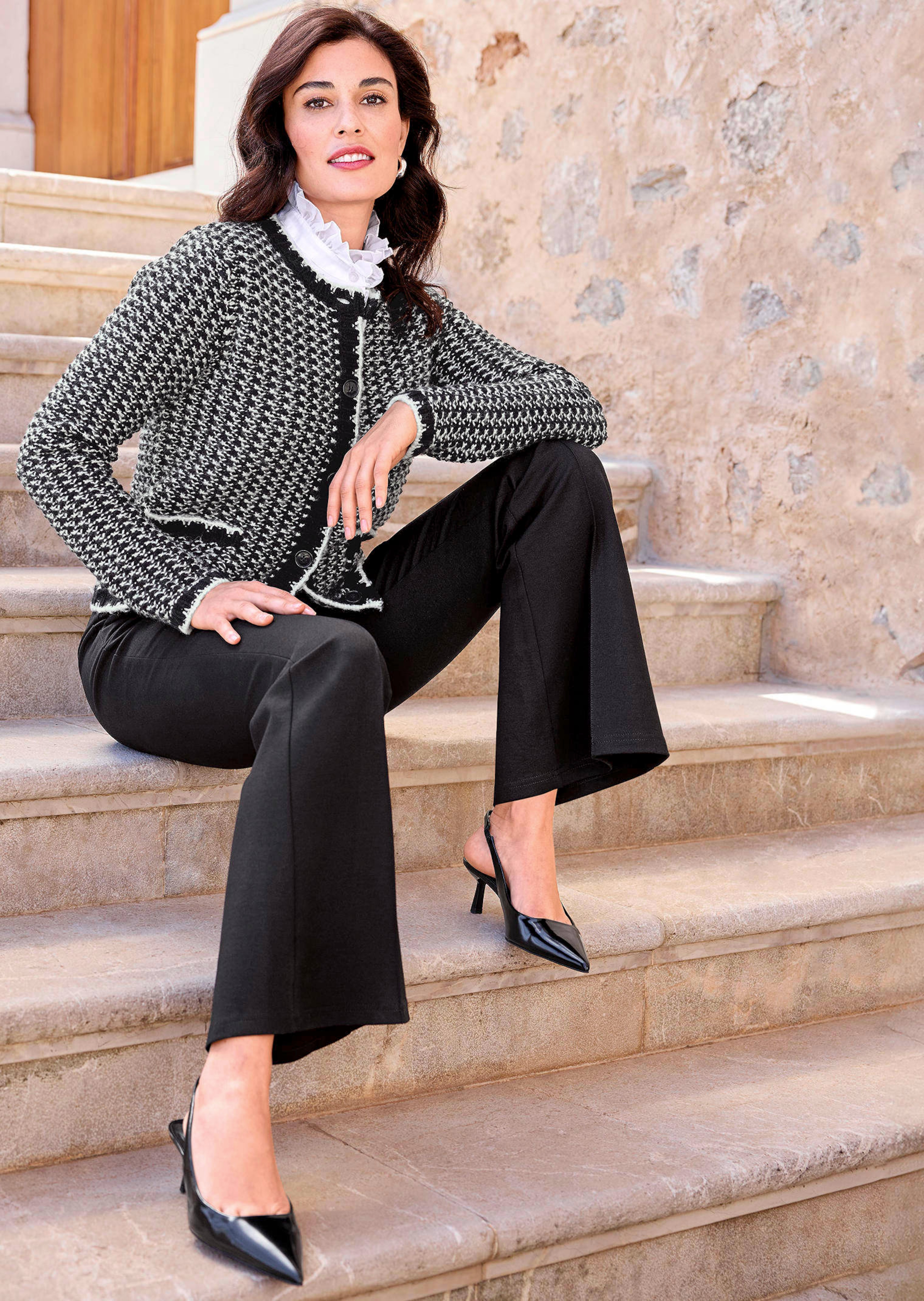 Die Strickjacke in edler Designer-Optik vereint Stil mit italienischer Grandezza. In edlem Schwarz-Weiss-Muster ist sie das i-Tüpfelchen für elegante Kombinationen. Die Abschlüsse sind kontrastfarben eingefasst, was viel Liebe zum Detail beweist. Rundhalsausschnitt, durchgehende Knopfleiste und zwei aufgesetzte Taschen machen den Couture-Look perfekt. Dank des Wollanteils ist das Modell warm und weich im Griff. Styling-Tipp: Die schicke Strickjacke ist ein Maschen-Highlight der besonderen Art und verleiht jedem Outfit eine stilvolle Note.