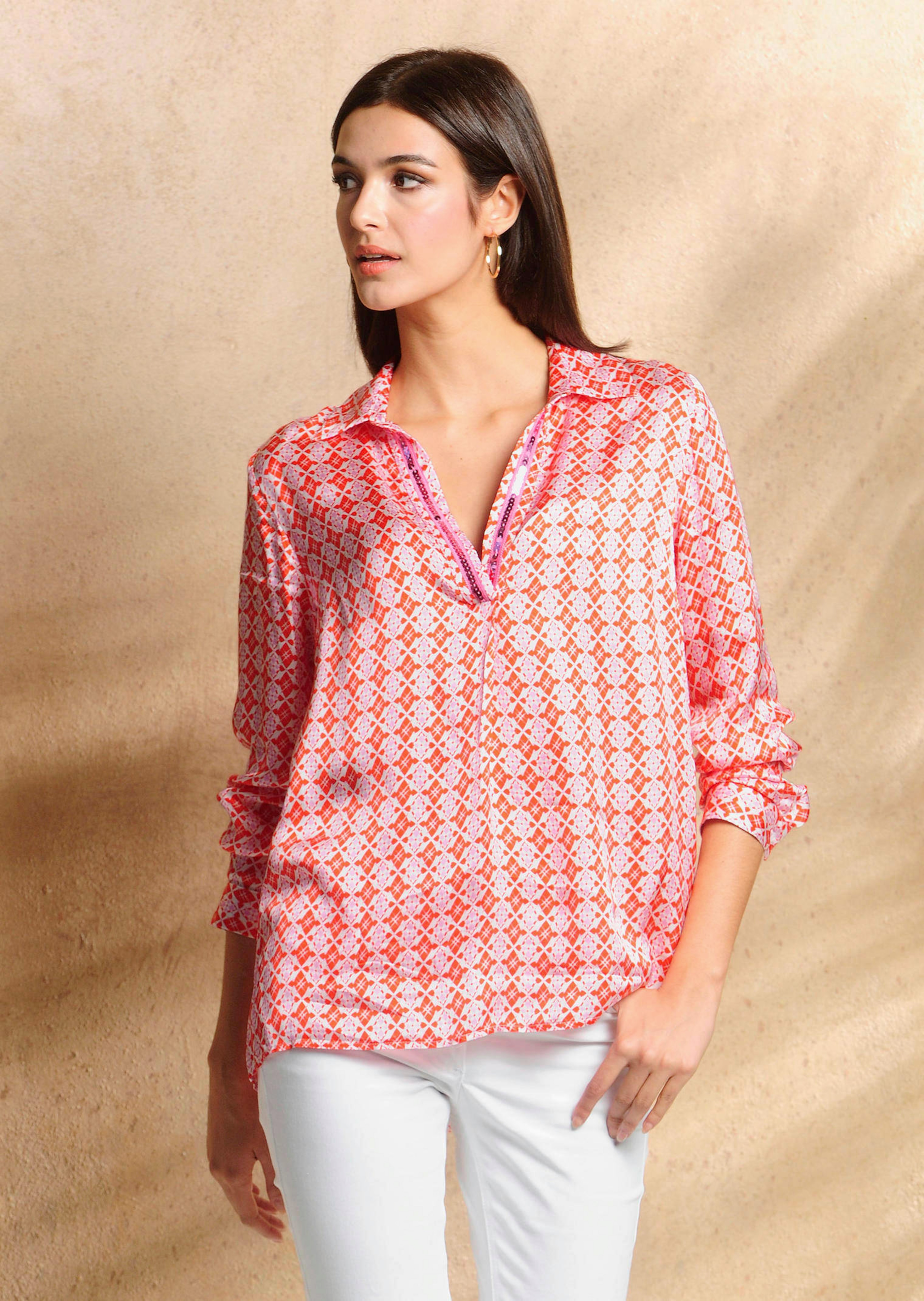 - Attraktive Hemdbluse als Schlupfform, Effektvoller Paillettenbesatz am V-Ausschnitt, Bequemfalte im Vorderteil und Quetaschfalte im Rückteil, Dezenter Glanz, Absoluter Trendsetter