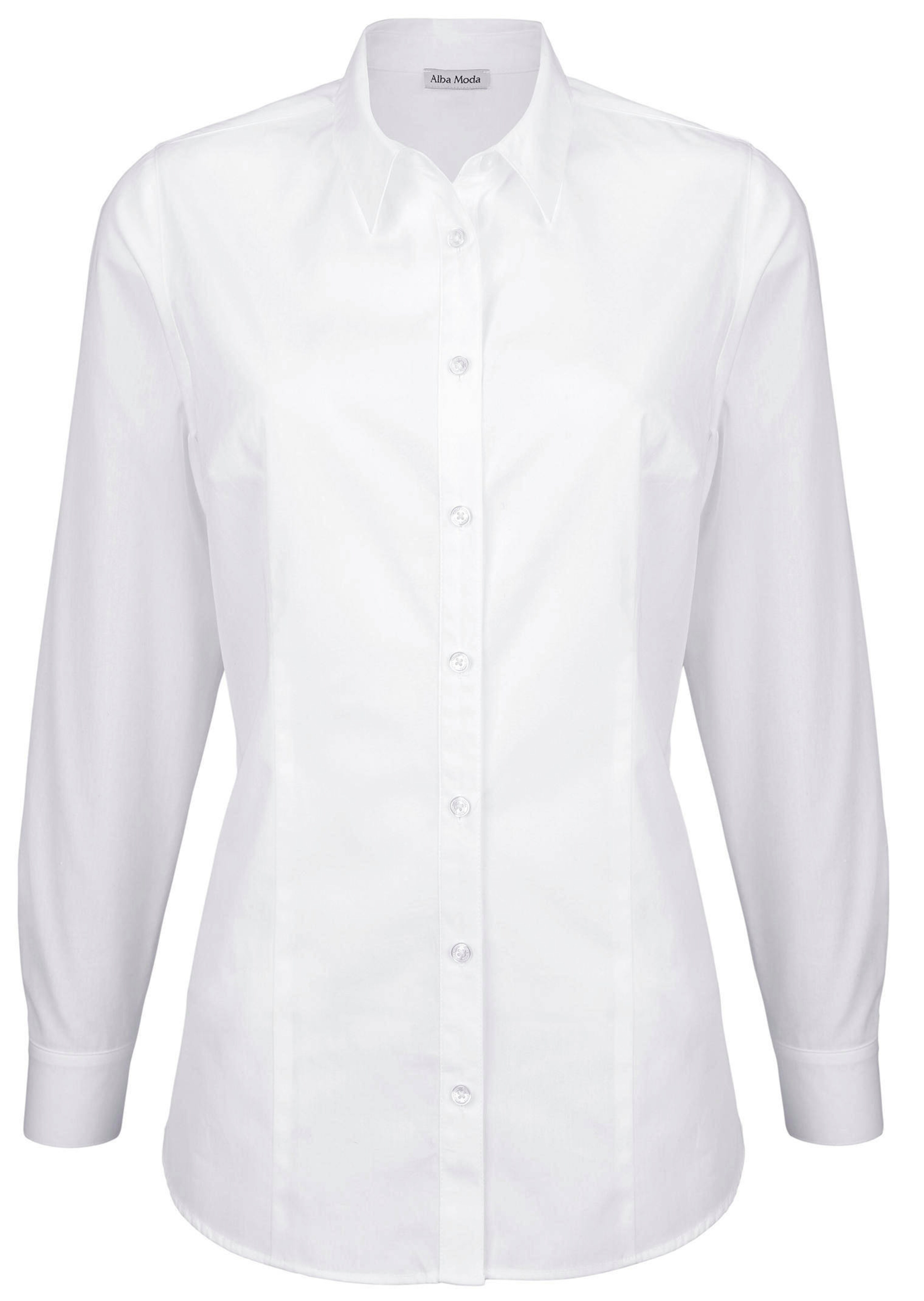 Basic-Bluse im klassischen Style. Der ideale Kombi-Partner für viele Gelegenheiten! Wertig verarbeitet mit Hemdblusen-Kragen sowie langen Ärmeln, abschließend mit passgenauer Manschette. Figurbetonte Form, Länge in Gr. 38 ca. 70 cm.