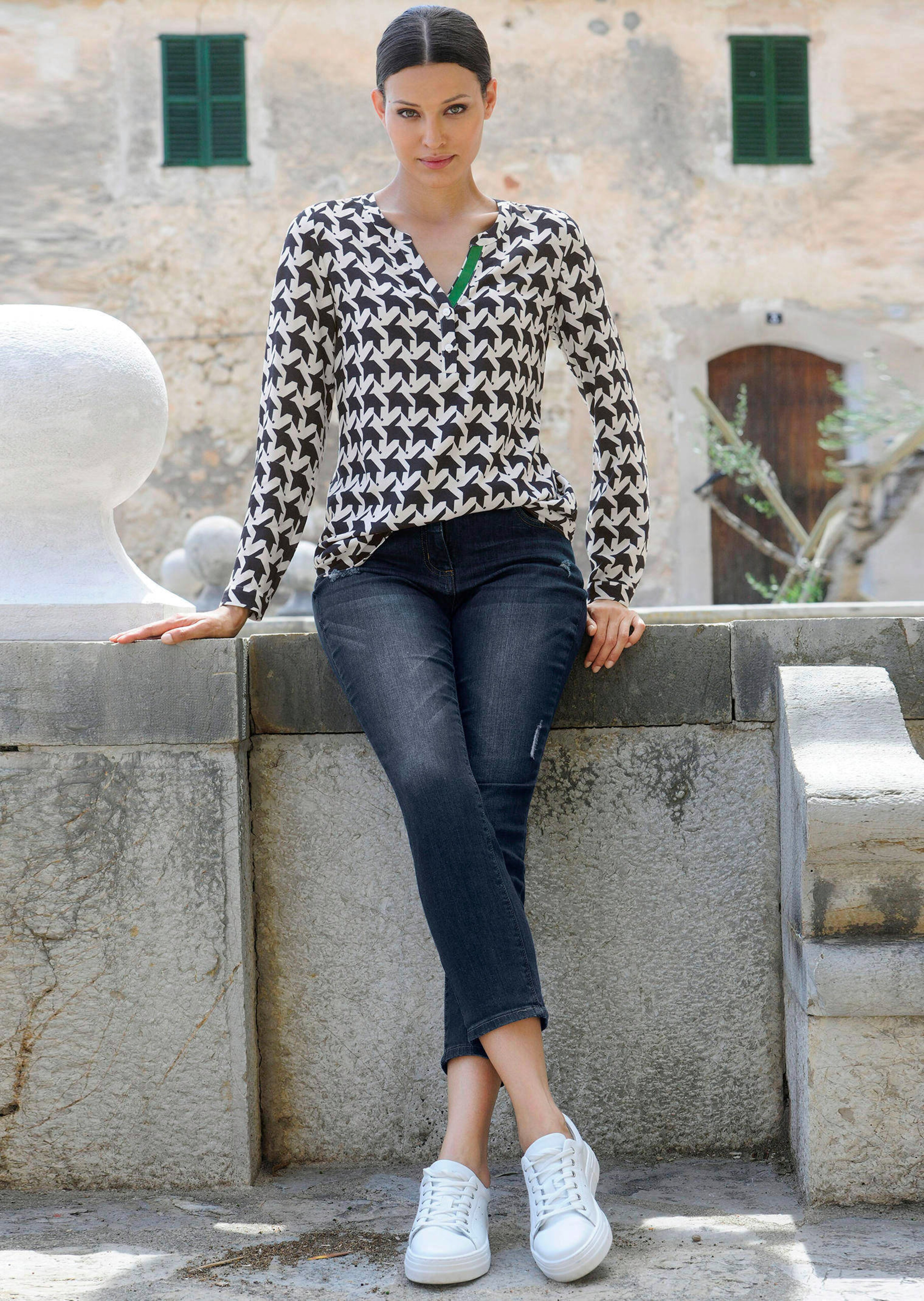 - Bluse mit Rundhalsausschnitt und kleinem V-Ausschnitt und konstrastfarbigem Rippsband mit 2 Knöpfen, Langarm mit Manschette, ebenfalls mit kontrastfarbigem Rippsband innenliegend, Modisches Hahnetrittdessin, Bequeme Schlupfform, Ideal für den Alltag und das Büro