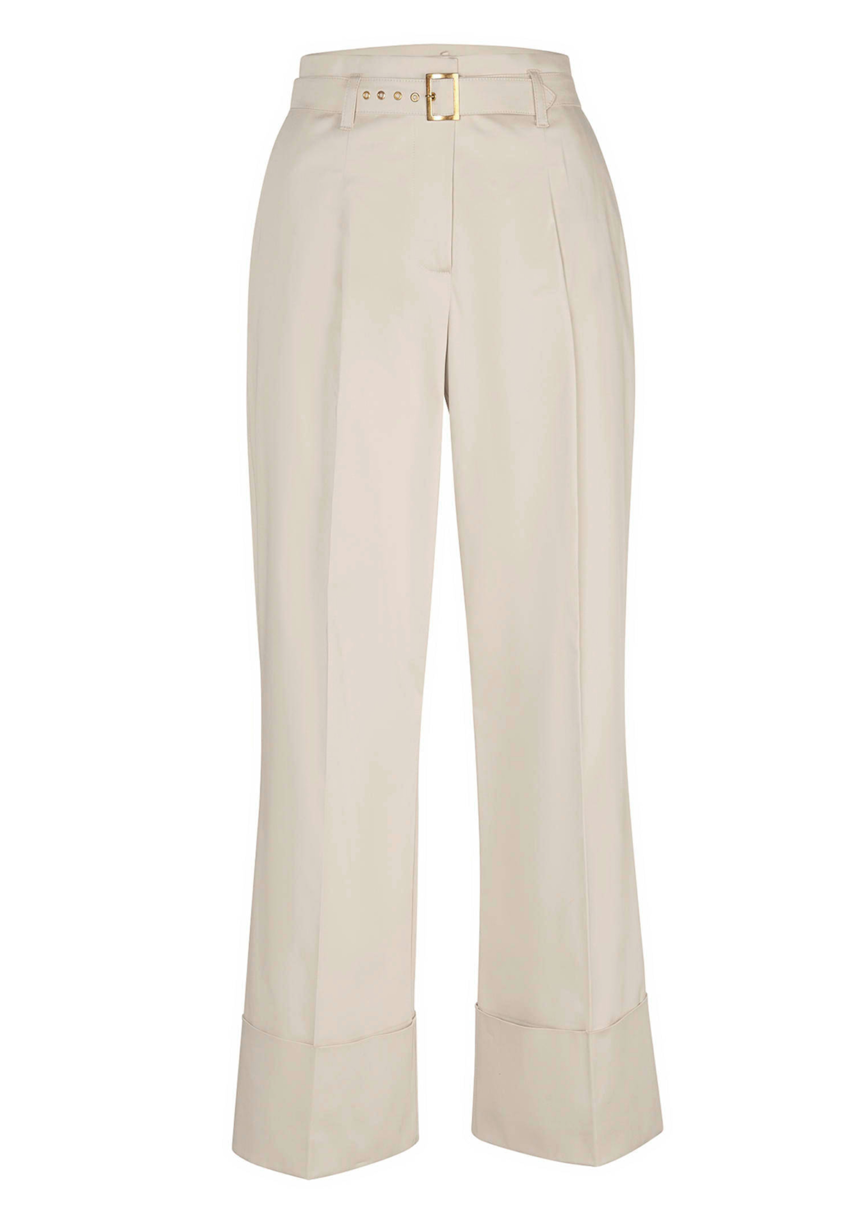 Hose in satinierter Qualität. Weite Form mit Umschlag. Bund mit Gürtelschlaufen und abnehmbarem Gürtel. Mit Reißverschluss und Häkchen zu schließen. Eingrifftaschen vorne und dekorative Paspeltaschen hinten. Innenbeinlänge in Gr. 38 ca. 70 cm.