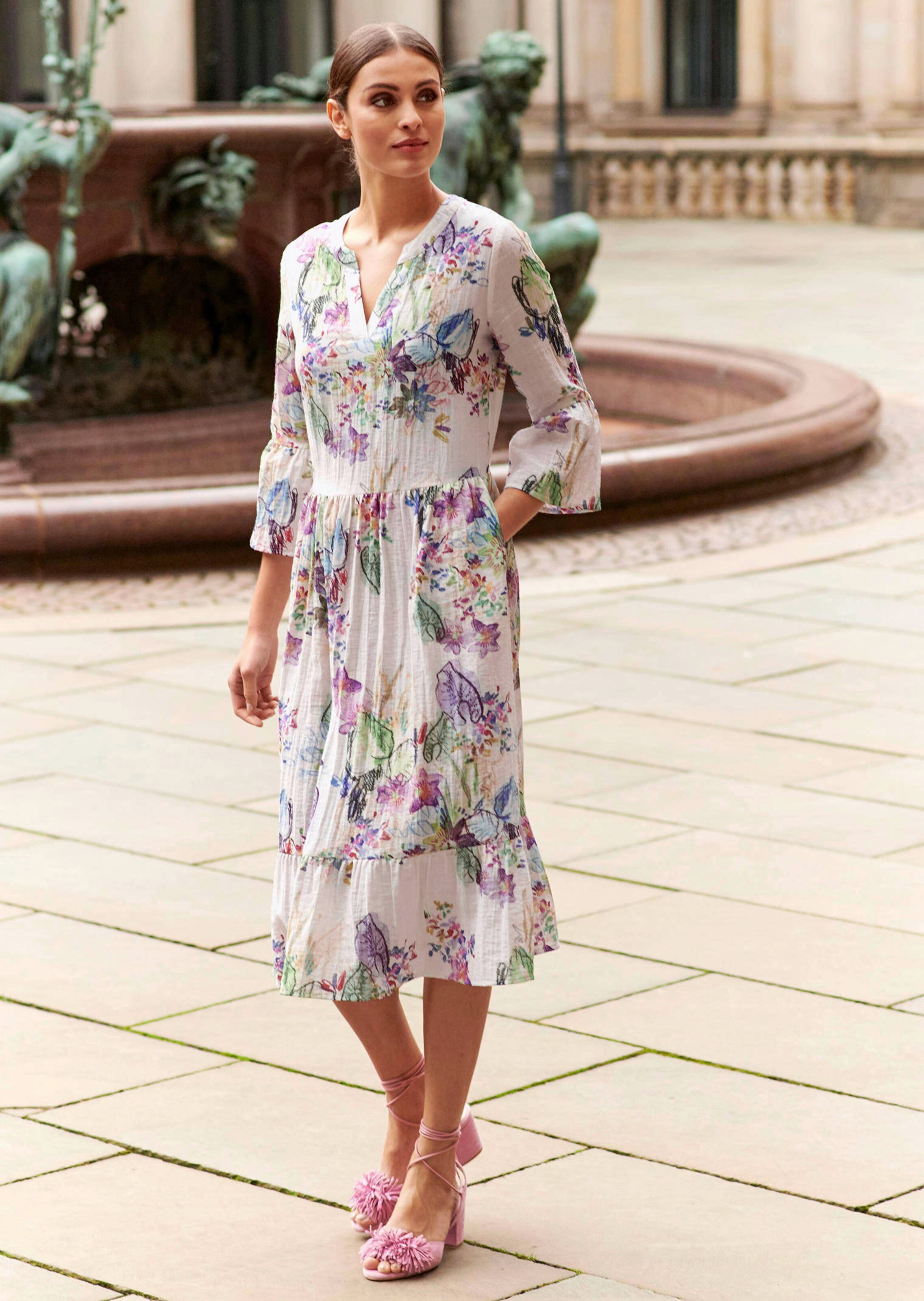 Erleben Sie Mode, die Spaß macht - zum Beispiel dieses Druckkleid von Alba Moda. Besonders schöne Details sind der Floralprint und der Volant. Es besitzt einen Rundhalsausschnitt. Darüber hinaus ist es gerade geschnitten. 3/4-langer Ärmel mit Volant. Gefertigt aus pflegeleichtem Material. Übrigens: Damit Ihr neues Kleid perfekt zur Geltung kommt, sollten Sie es mit einem oder mehreren Accessoires ergänzen. Hierbei ist Stilgefühl gefragt. Während zum Sommerkleid auch Modeschmuck oder Accessoires im Ethno-Stil passen, ist für die elegante Abendrobe hochwertiger und klassischer Schmuck gefragt. Bestellen Sie dieses Druckkleid von Alba Moda ganz entspannt online, und im Handumdrehen wird er zu Ihnen nach Hause geliefert.