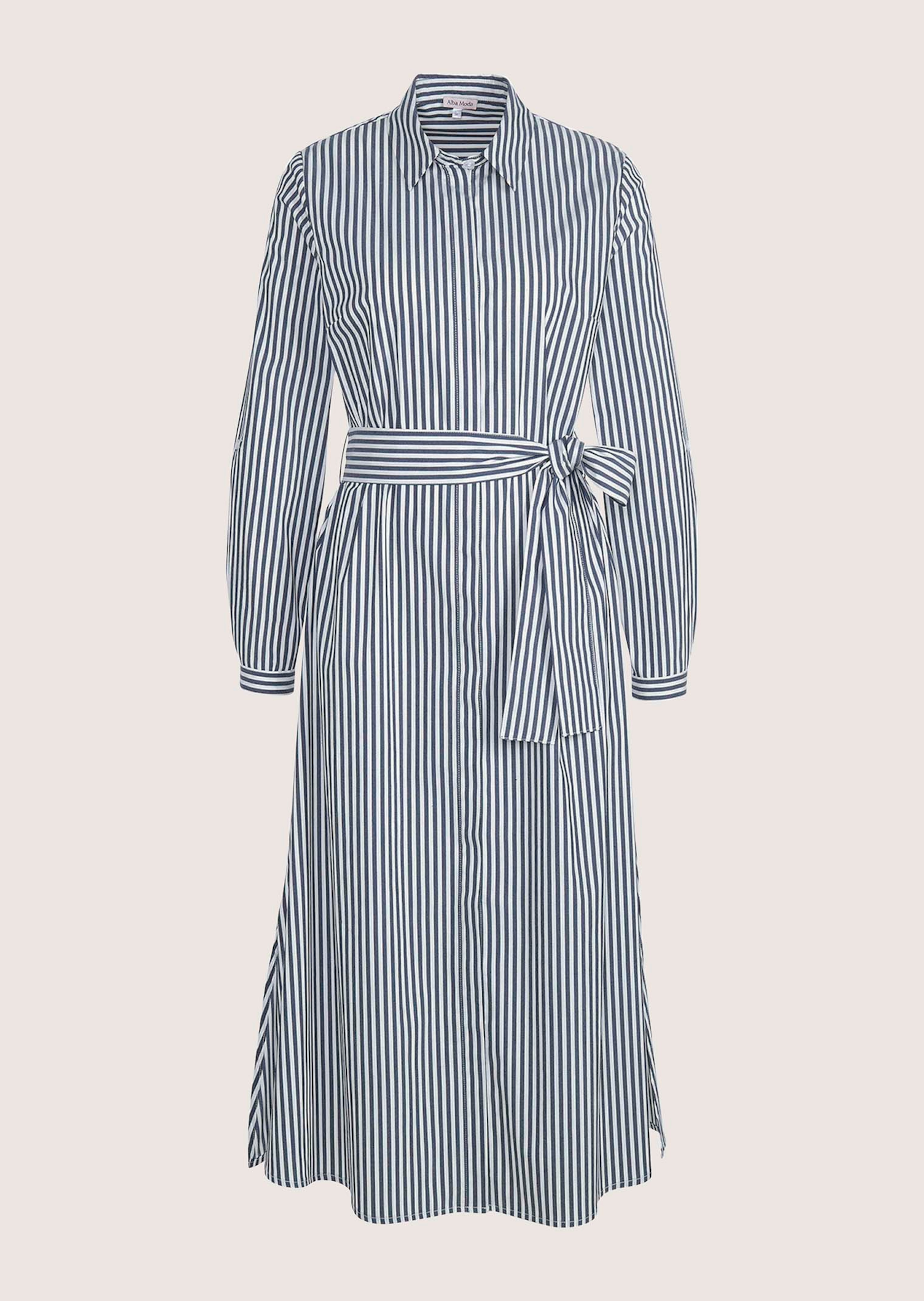 Kleid mit Bindeband und verdeckter Knopfleiste. Ärmel mit kleiner Manschette und Knopf mit Krempel-Option. Länge in Gr. 38 ca. 124 cm.