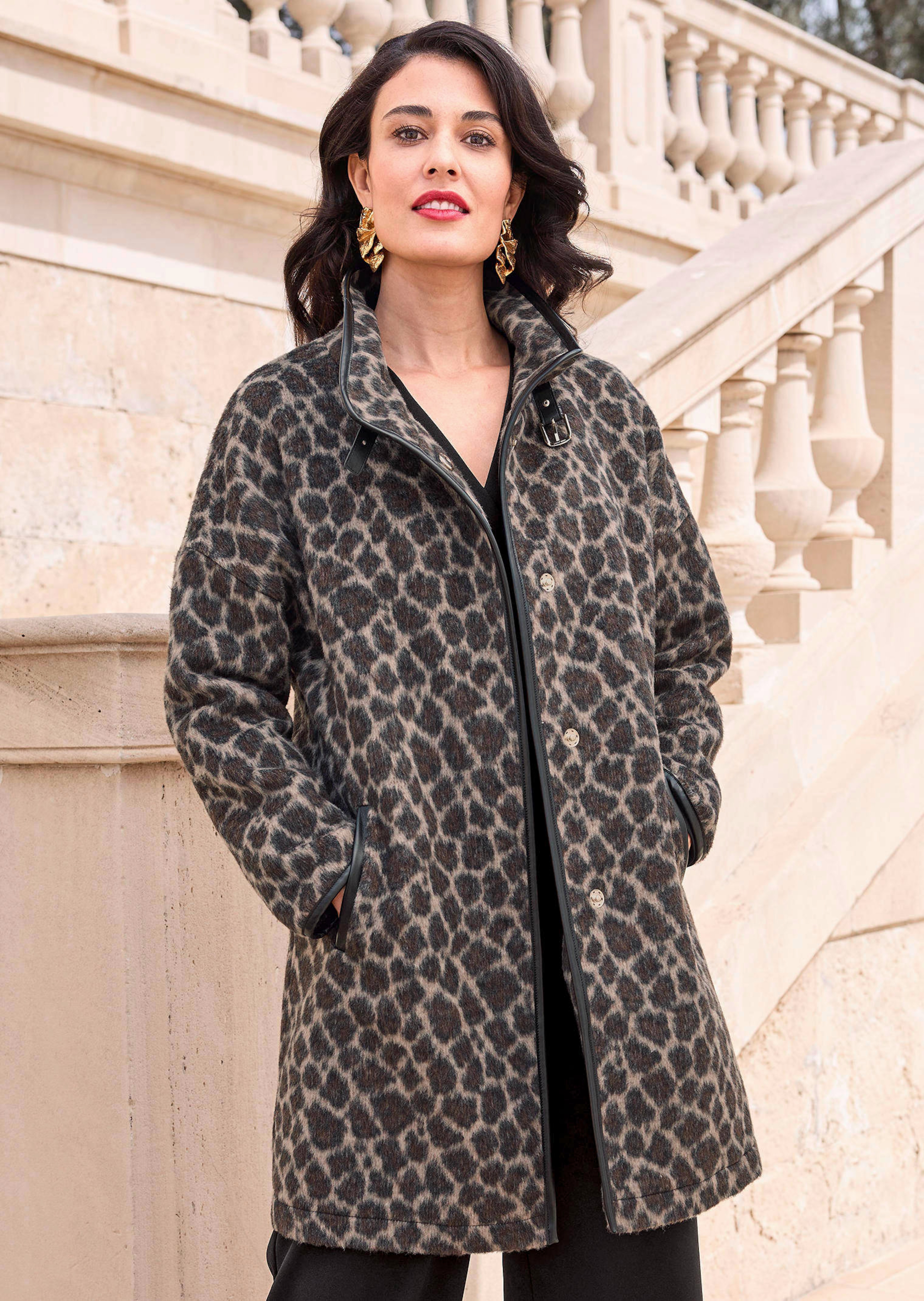 Der Kurzmantel mit Animal-Print bereichert Ihre Garderobe auf modisch-elegante Weise. Das auffällige Muster macht den Mantel zu einem echten Blickfang, während ihm die Lederpaspeln eine hochwertige Note verleihen. Der Riegel am Stehkragen und die Druckknöpfe sorgen für einen stilvollen und sicheren Verschluss. Gefertigt aus hochwertiger Wirkware mit Wollanteil, bietet dieser Mantel sowohl Komfort als auch eine hervorragende Passform. Eingrifftaschen runden den Look ab. Länge in Gr. 38 ca. 86 cm. Styling-Tipp: Kombinieren Sie den traumhaft schönen Leomantel mit schlichten, einfarbigen Kleidungsstücken, um den Print in den Vordergrund zu stellen. Länge in Gr. 38 ca. 86 cm.