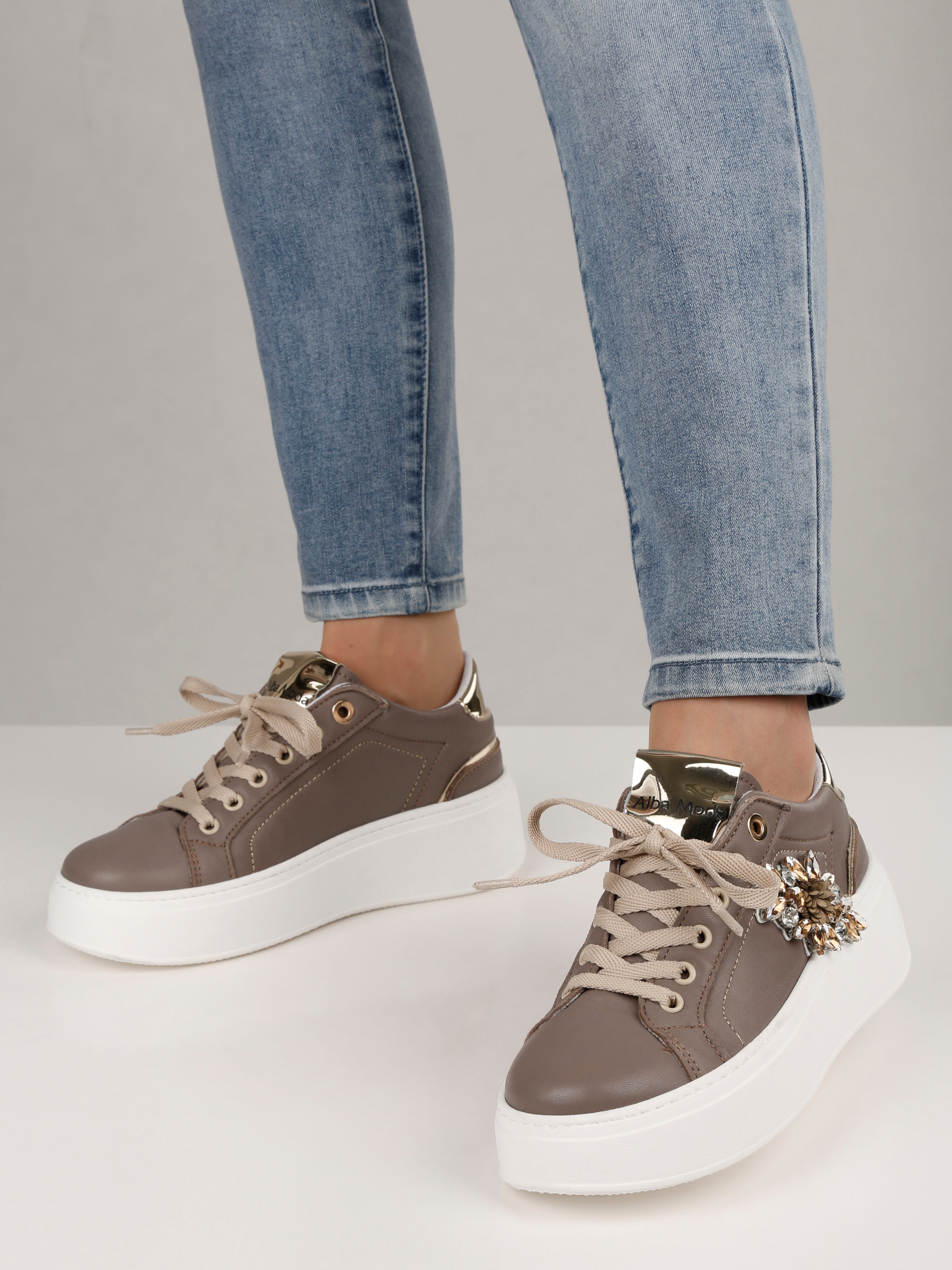 Sie sind auf der Suche nach neuen Sneakern? Dieses Modell von Alba Moda ist aus Glattleder und Synthetikmaterial gefertigt und garantiert das Richtige für Sie. Plateauabsatz mit einer Höhe von 5,5 cm. Das Plateau hat eine Höhe von 4 cm. Darüber hinaus ist die Sohle aus Synthetikmaterial. Die Decksohle ist aus Leder. Dieses Modell hat leicht profilierte Sohle. Für einen normalen Fuß geschnitten. Schließen lässt er sich über eine Schnürung. Diese Schuhe entsprechen dem Größensystem: Europäisch (EU).