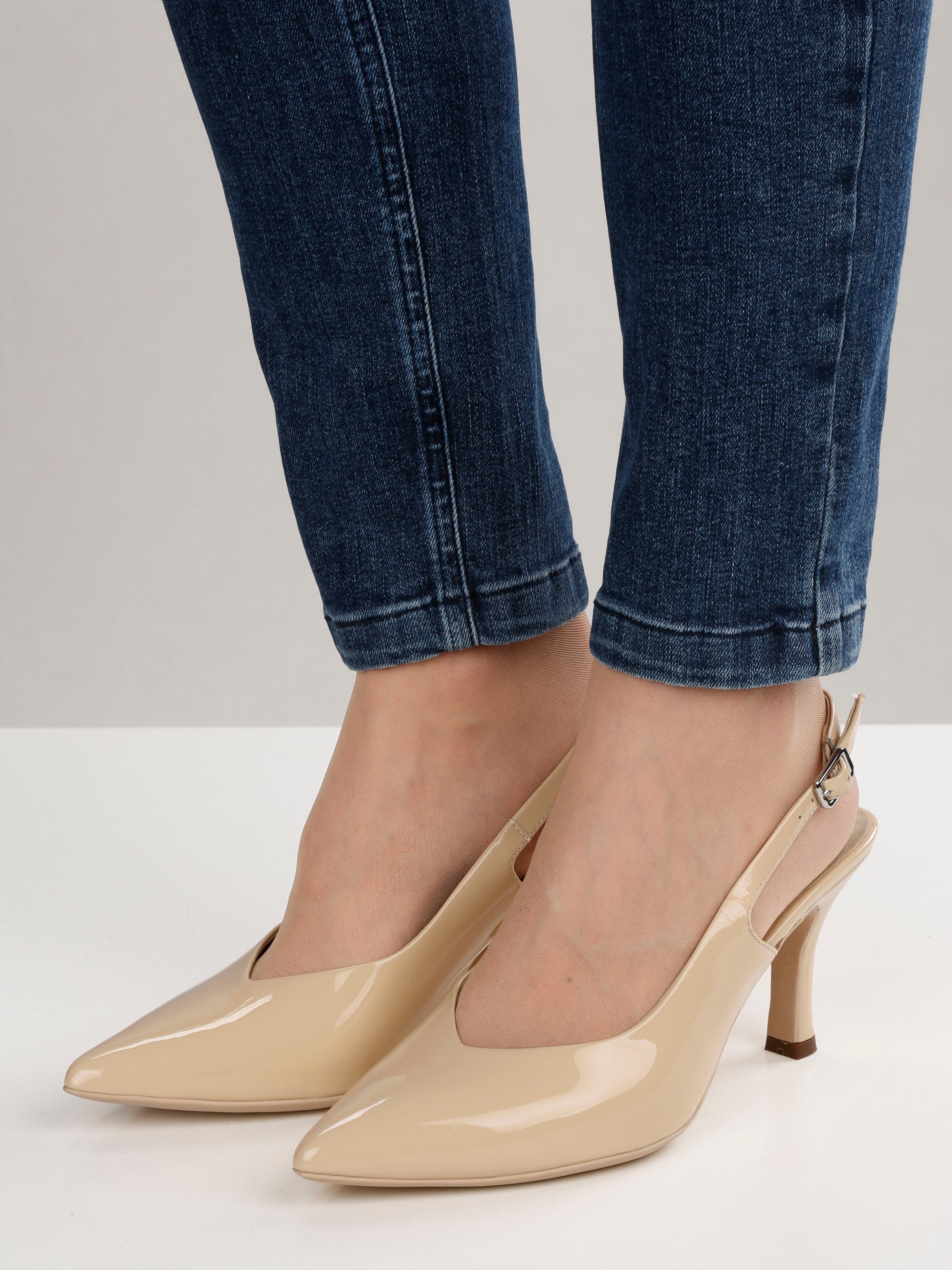 Ein Klassiker, der in keinem Schuhregal fehlen darf! Diese Slingpumps aus glänzendem Lackleder verleihen jedem Look sofort Eleganz. Der schmal zulaufende V-Ausschnitt betont den Spann, während der verstellbare Fersenriemen für Halt sorgt. Pfennigabsatz mit einer Höhe von 7,5 cm. Diese Schuhe entsprechen dem Größensystem: Britisch (UK).
