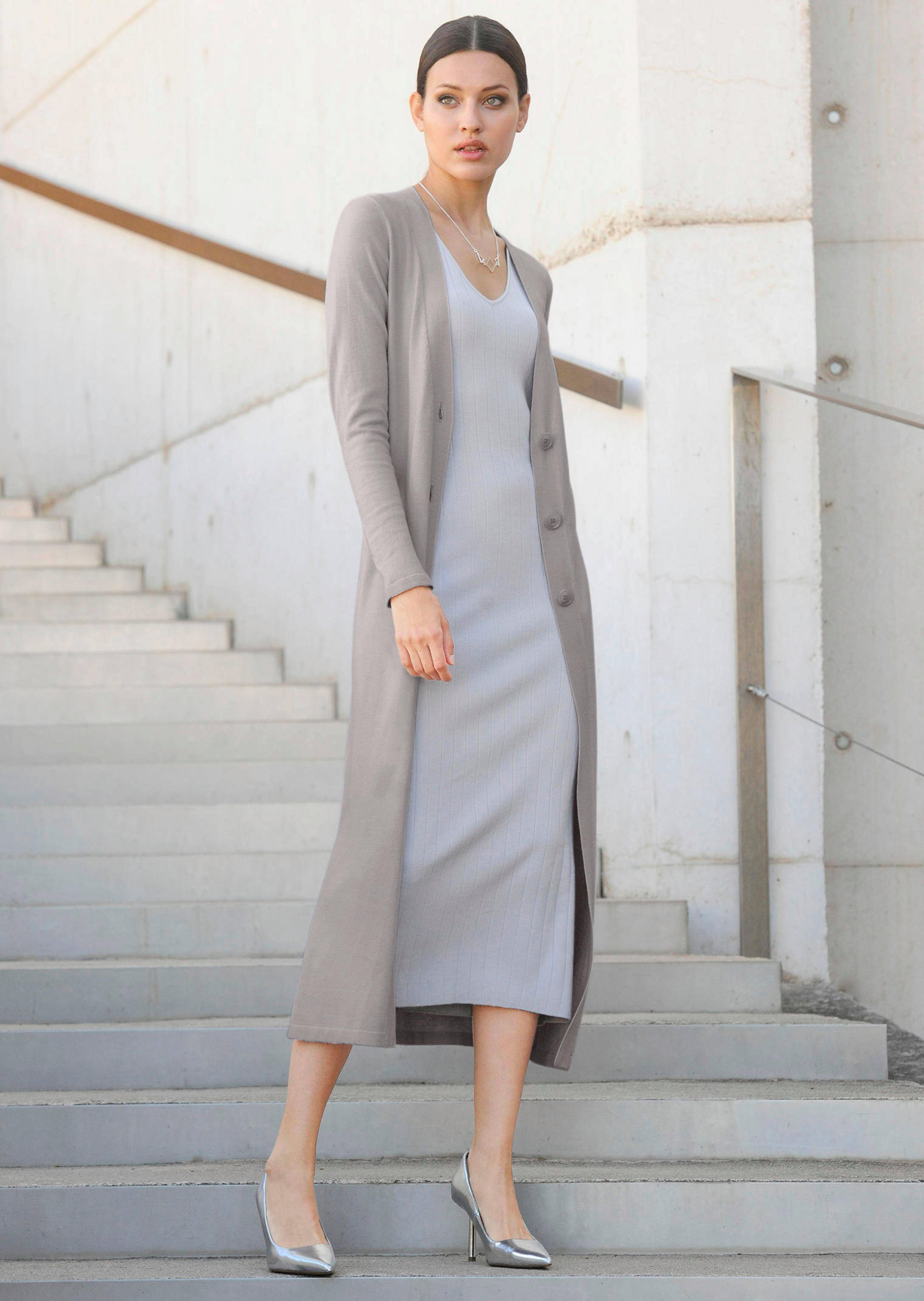Der wunderschöne Strickmantel verkörpert zeitlosen Chic in seiner reinsten Form. Das geradlinige Design mit V-Ausschnitt, langen Ärmeln und Knopfleiste macht ihn zum edlen Begleiter mit Stil. Die elegante Longform umschmeichelt die Silhouette auf raffinierte Weise, während die Feinstrick-Qualität mit Viskose dem Strickmodell einen sanften Glanz verleiht. Gesamtlänge in Gr. 38 ca. 124 cm. Styling-Tipp: Für ein Komplett-Outfit mit Klasse kombinieren Sie den feinen Strickmantel mit passendem Strickkleid.