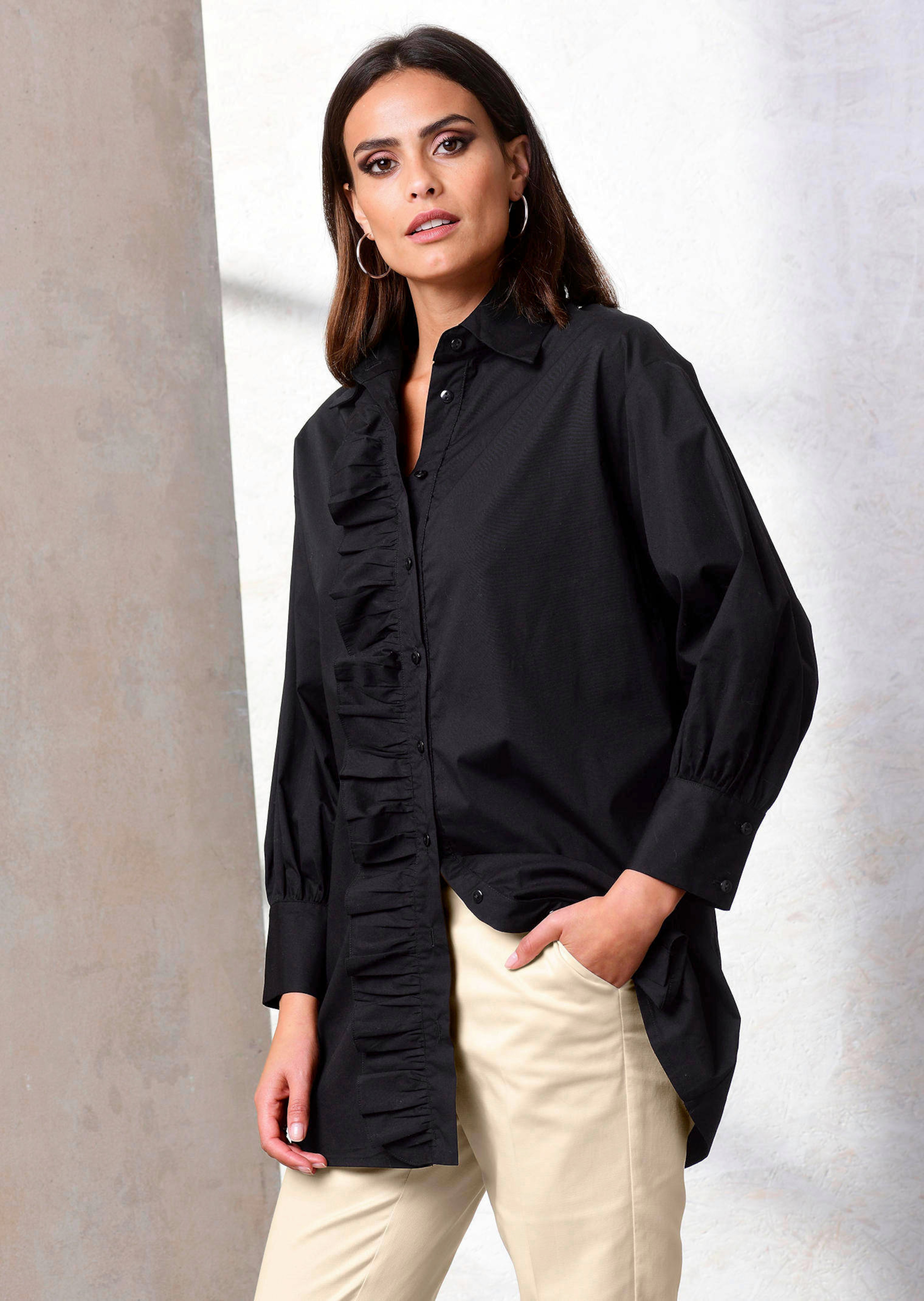 Vous trouverez ici dans notre boutique en ligne différents styles pour les occasions les plus diverses. Que pensez-vous par exemple de ce chemisier à volants d'Alba Moda Les volants sont particulièrement beaux. Elle a un col chemise. Grâce à sa coupe qui épouse la silhouette, elle est particulièrement flatteuse. Longues manches ballon avec manchette. Le tissu utilisé est le coton. Et nous avons encore une astuce de style pour vous : lorsque vous choisissez un sac et des chaussures pour votre tenue, ils ne doivent pas nécessairement être de la même couleur. L'important est que le style soit adapté et que les couleurs s'harmonisent. Il est également agréable de retrouver un détail ou un motif du vêtement dans les accessoires. Faites-vous plaisir avec la blouse à volants d'Alba Moda - commandez-la maintenant dans notre boutique !