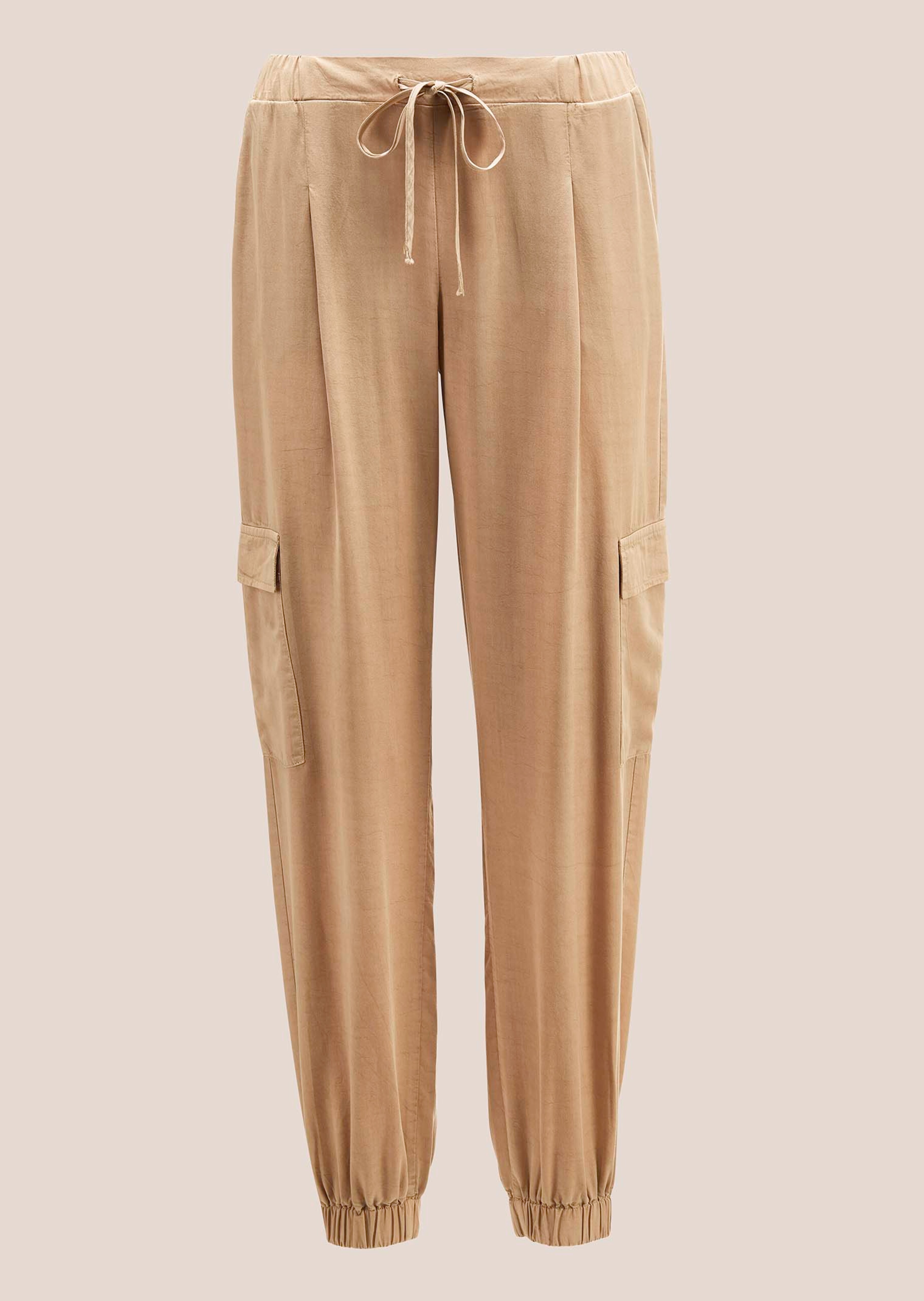 Hose im Cargo-Style in satinierter Optik. Komfortable Bundlösung mit glattem Bund vorne und Raffungen an der Rückseite. Bindeband zum Regulieren der Bundweite. Mit Eingrifftaschen vorne, dekorativen Taschenklappen hinten und seitlich aufgesetzten Cargo-Taschen. Elastische Bündchen an den Saumenden. Innenbeinlänge in Gr. 38 ca. 74 cm.
