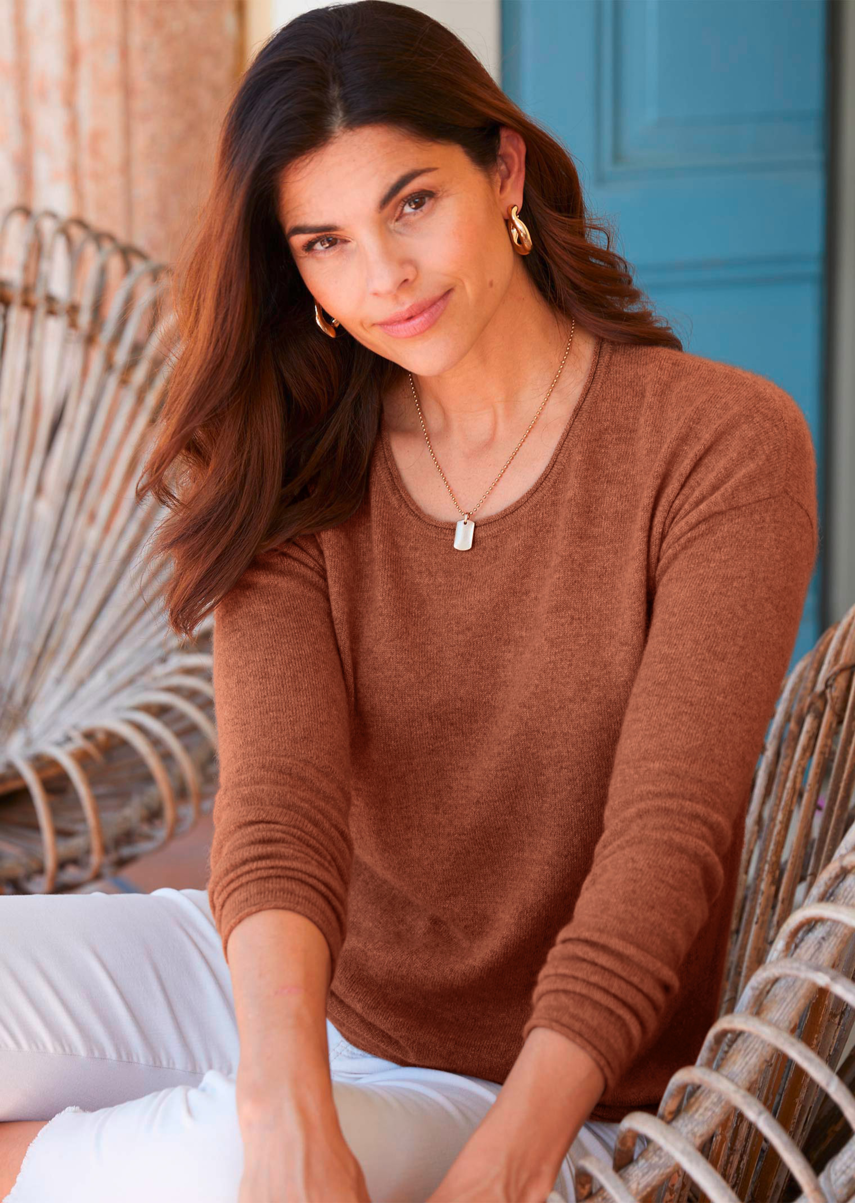 À encolure dégagée, en cachemire haut de gamme, par ALBA MODA. Coupe chic et décontractée. Épaules descendues et manches ajustées. Bords roulottés au bas des manches et à la base.
