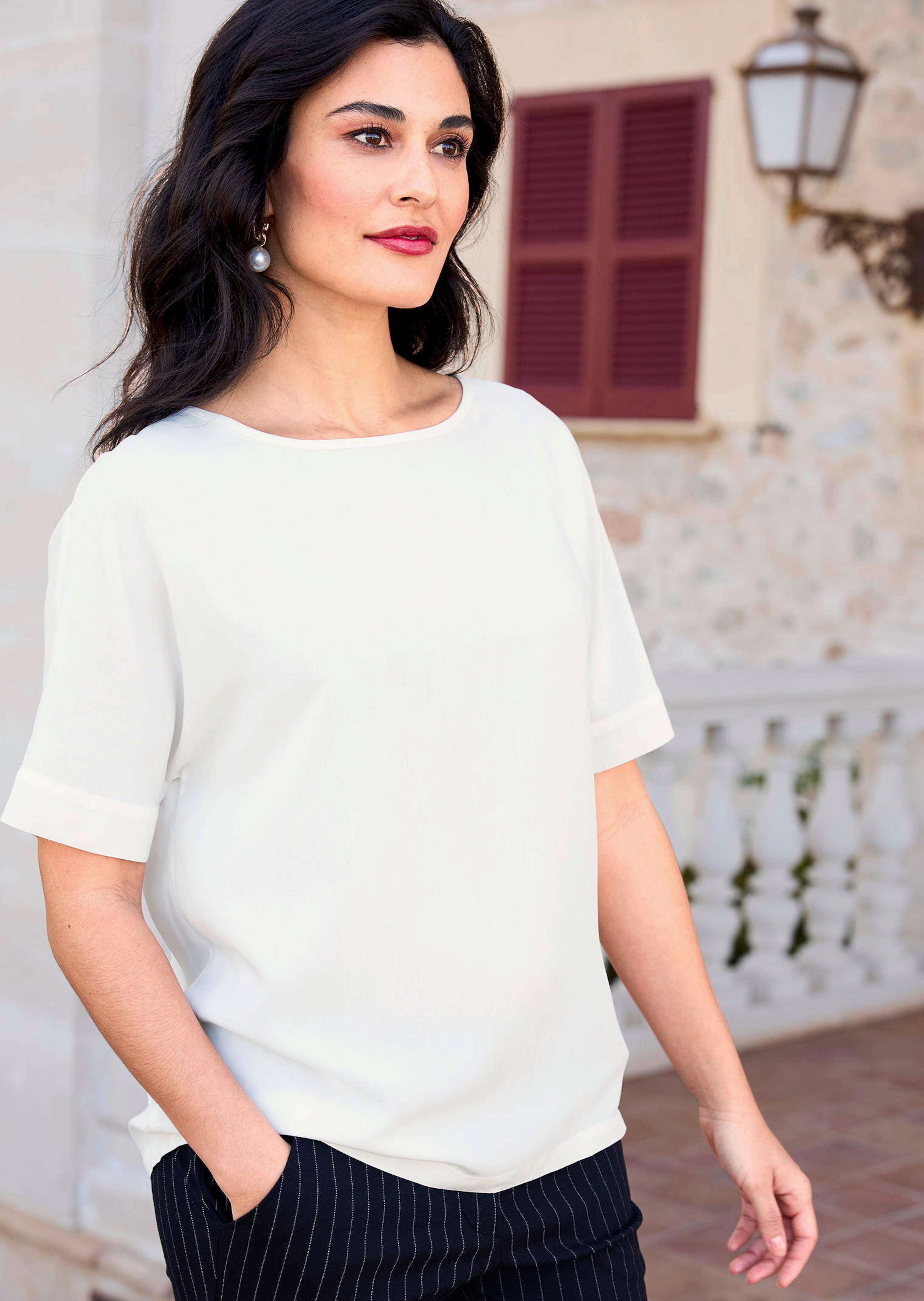 Épaules descendues. Matière légère et fluide. Fermeture boutonnée sur la nuque. Longueur en taille 38 env. 64 cm.