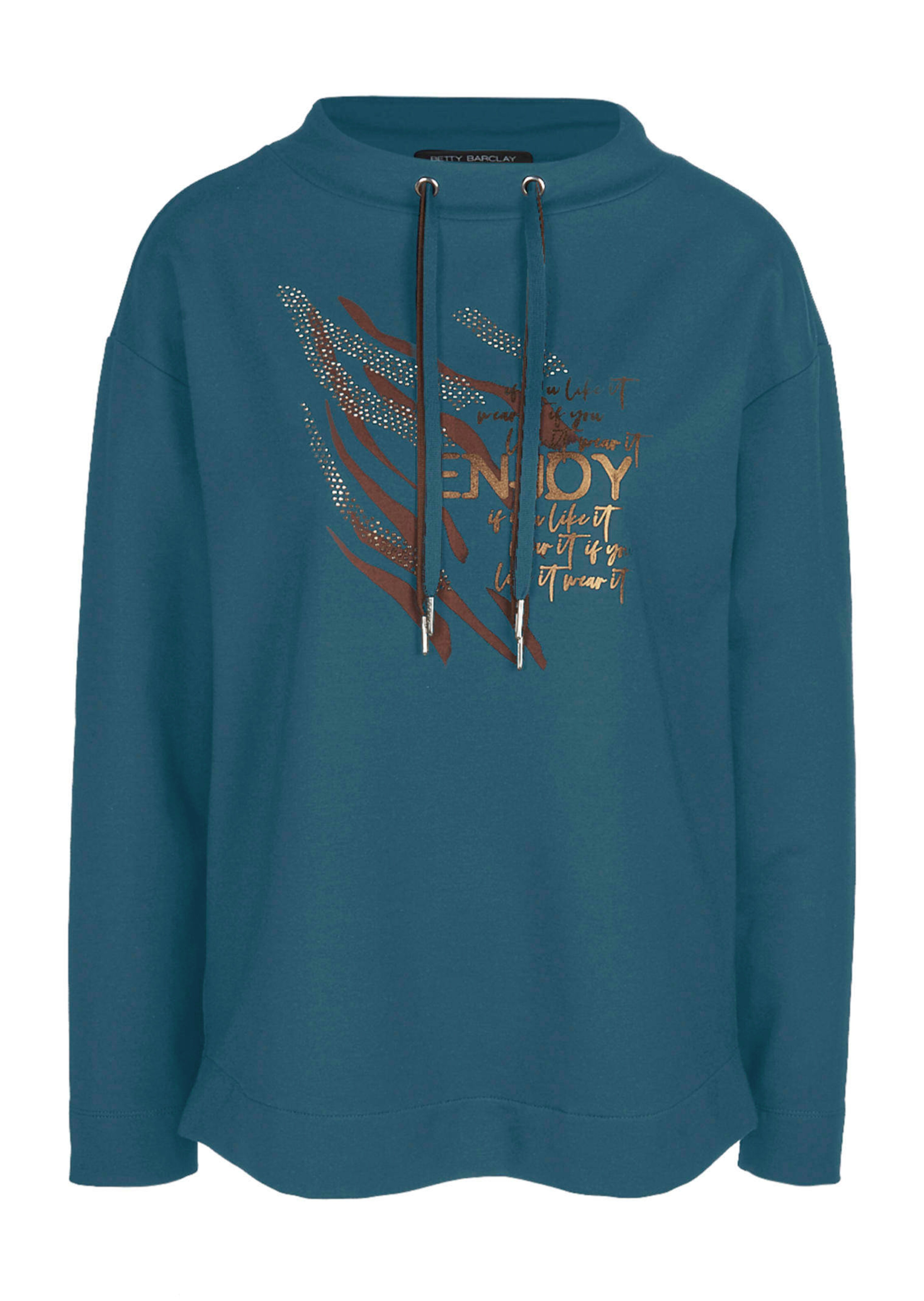 Das Sweatshirt von BETTY BARCLAY ist ein stylischer Allrounder für die kalte Jahreszeit! Der gerade, längere Schnitt mit überschnittener Schulter und langen Ärmeln sitzt bequem. Der Stehkragen mit Tunnelzug und dekorativen Bändern verleiht dem Modell eine lässige Note. Besonders schön präsentiert sich der Frontprint im attraktiven Animal-Muster, welcher mit funkelnden Glitzersteinen verziert ist. Länge in Gr. 38 ca. 66 cm. Styling-Tipp: Der Cosy Style des Sweatshirts wirkt am besten mit einer schmalen Hose oder einer Joggpants. Genießen Sie den Casual Look zu Hause oder unterwegs.