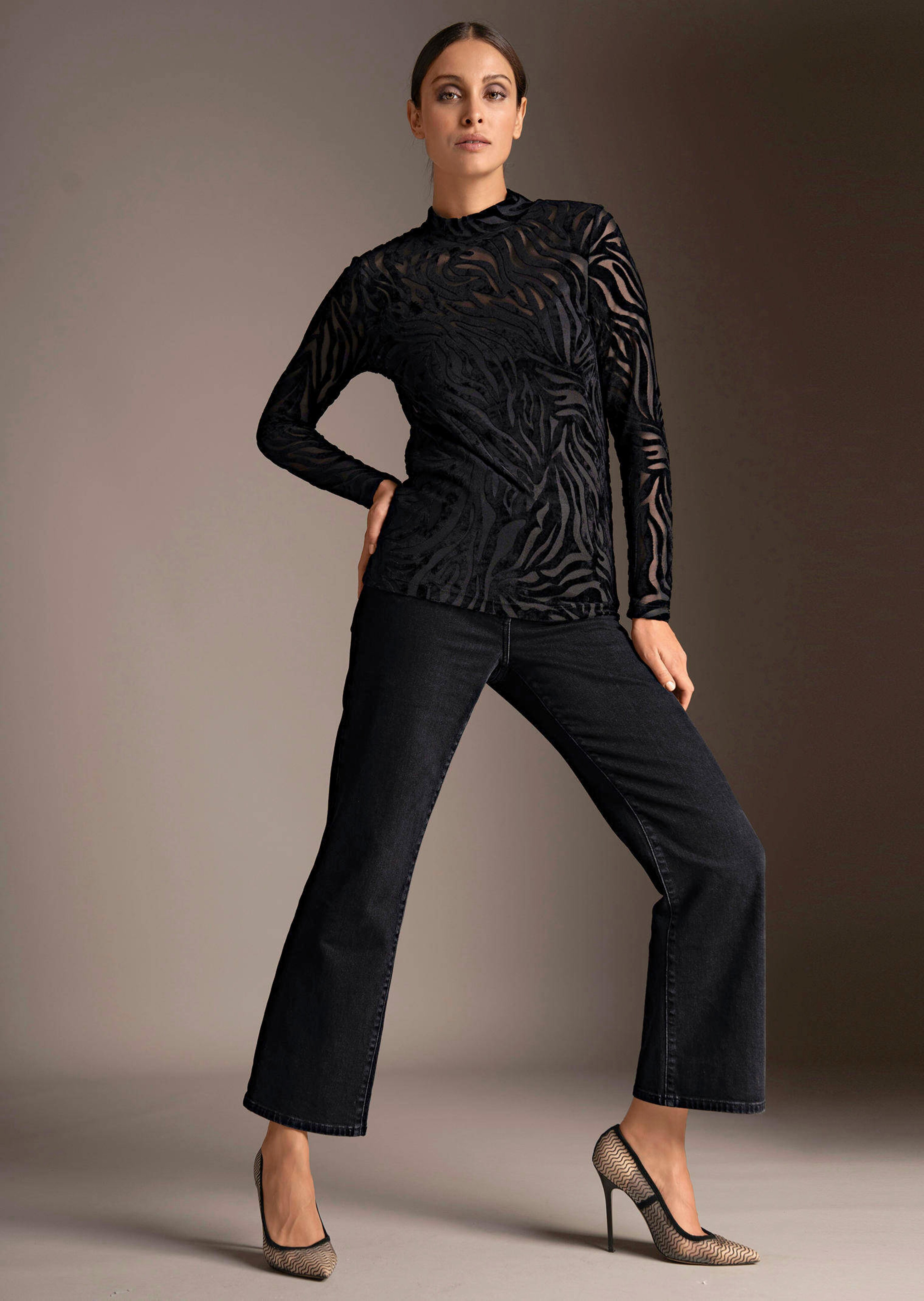 Découvrez une mode qui fait plaisir - par exemple ce t-shirt à manches longues d'Alba Moda Le motif all-over et la qualité dévorée sont un vrai point fort. Il a un col montant. Sa forme cintrée lui confère une belle silhouette. Manches longues avec une finition droite. Fabriqué en matière facile d'entretien et en viscose. Par ailleurs : une tenue n'est bien sûr pas terminée tant que les chaussures et le sac ne sont pas assortis. Deux choses doivent être en harmonie : La couleur et le style. Si vous portez des escarpins, par exemple, un sac à main élégant s'impose. La couleur ne doit certes plus être exactement la même qu'auparavant, mais elles ne doivent pas non plus se "mélanger". Faites-vous plaisir avec le t-shirt à manches longues d'Alba Moda - commandez-le tout de suite dans notre boutique !