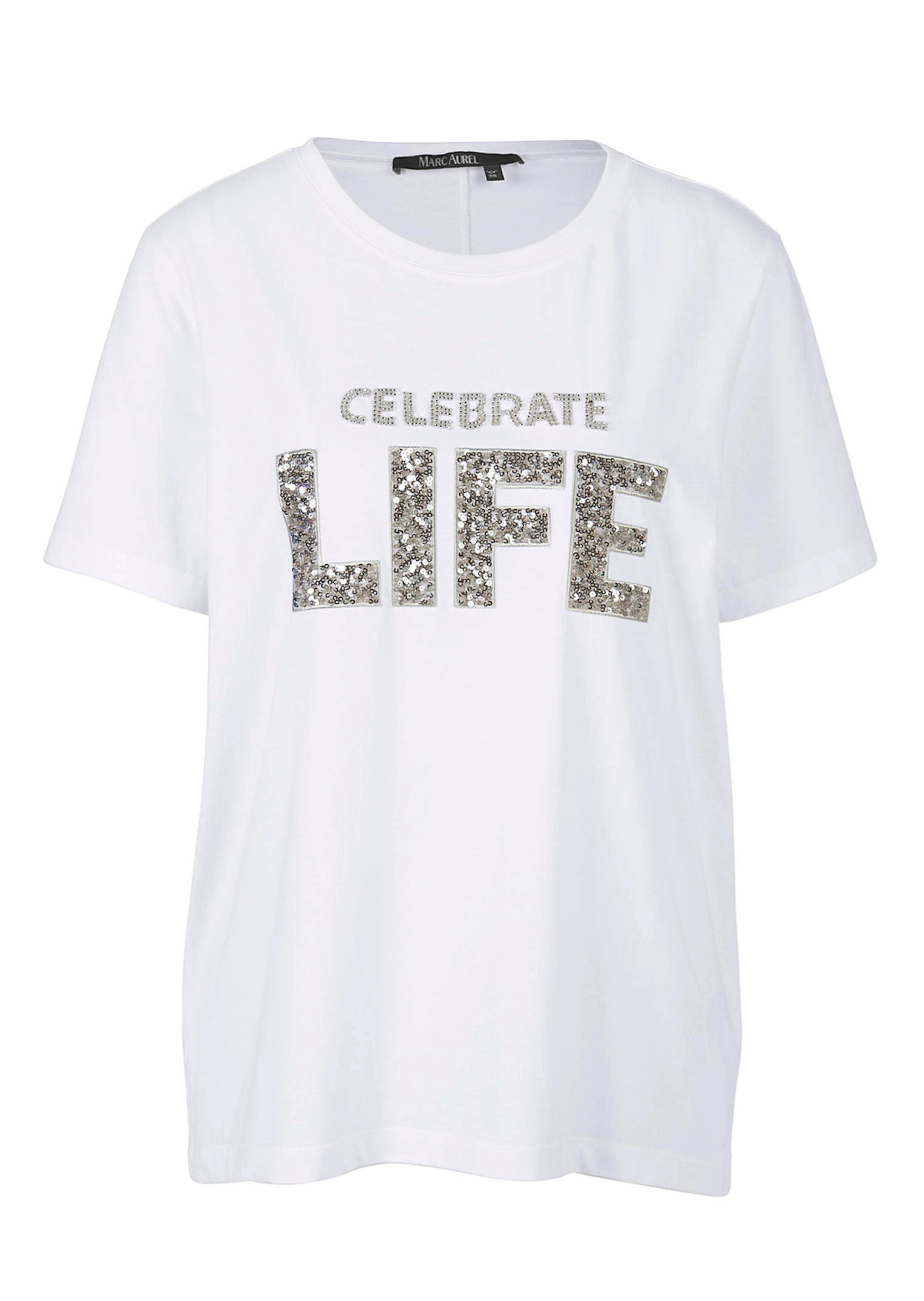 Shirt mit Pailletten von MARC AUREL. Der funkelnde Wording-Print ist mit Pailletten besetzt und begeistert mit seiner lebensbejahenden Botschaft. Die legere Passform mit klassischem Rundhalsausschnitt, der mit Bündchen gearbeitet ist, bringt den Highlight-Druck noch mehr zur Geltung. Das Rückteil ist mit einer dekorativen Ziernaht und kleinem Label-Emblem gearbeitet. Mit Halbarm und geraden Saumabschlüssen. Aus Baumwolle. Länge in Gr. 38 ca. 64 cm. Styling-Tipp: Kombinieren Sie das T-Shirt mit einem eleganten Plissée- oder Tüllrock und bringen Sie sportive Eleganz ins Outfit!