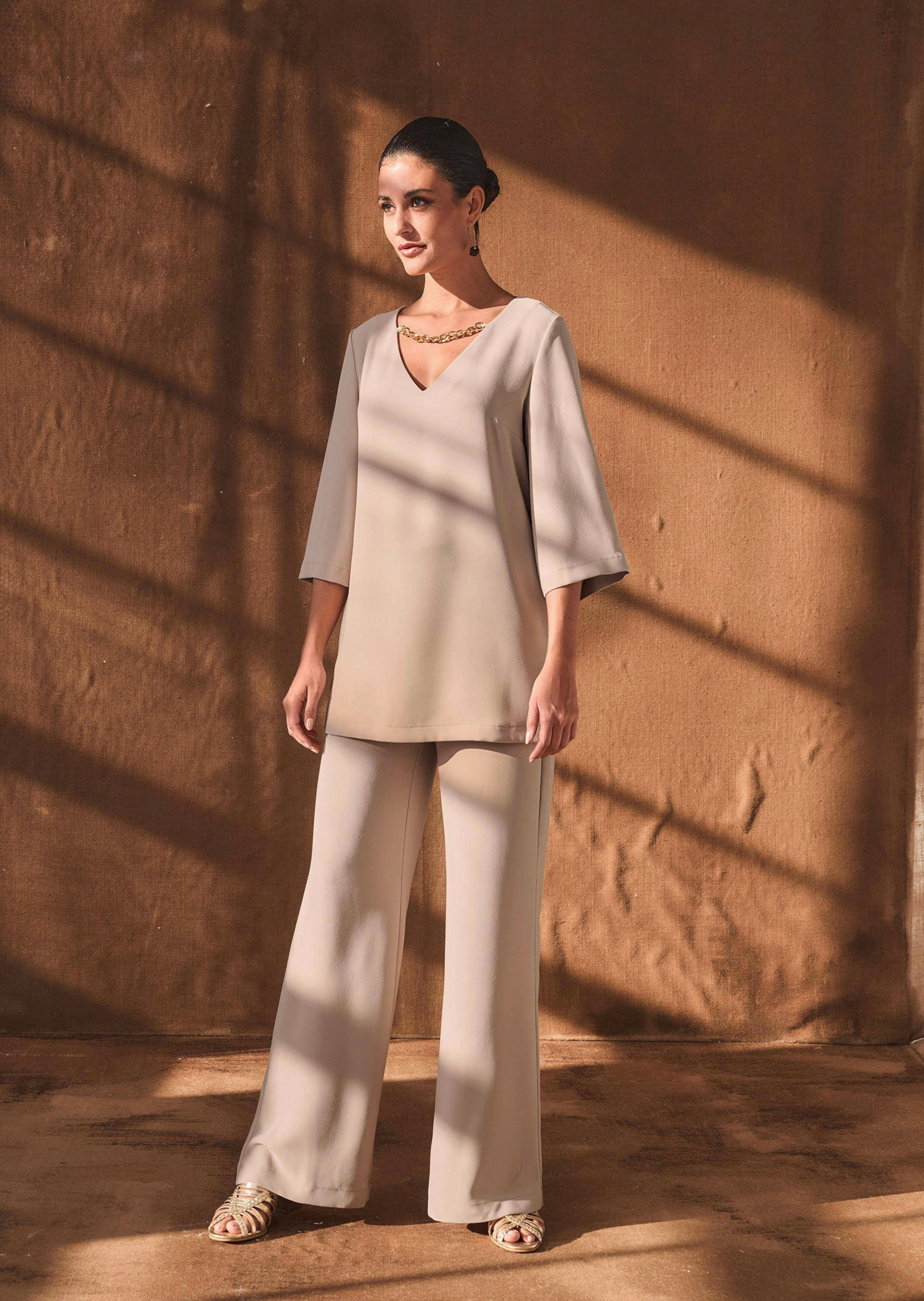 - Blouse col rond et petite encolure en V, ornée d'une chaîne dorée, Manches trompettes, fermeture à glissière dans le dos, Ourlet droit avec petites fentes latérales, Point fort mode, Partenaire idéal pour les combinaisons